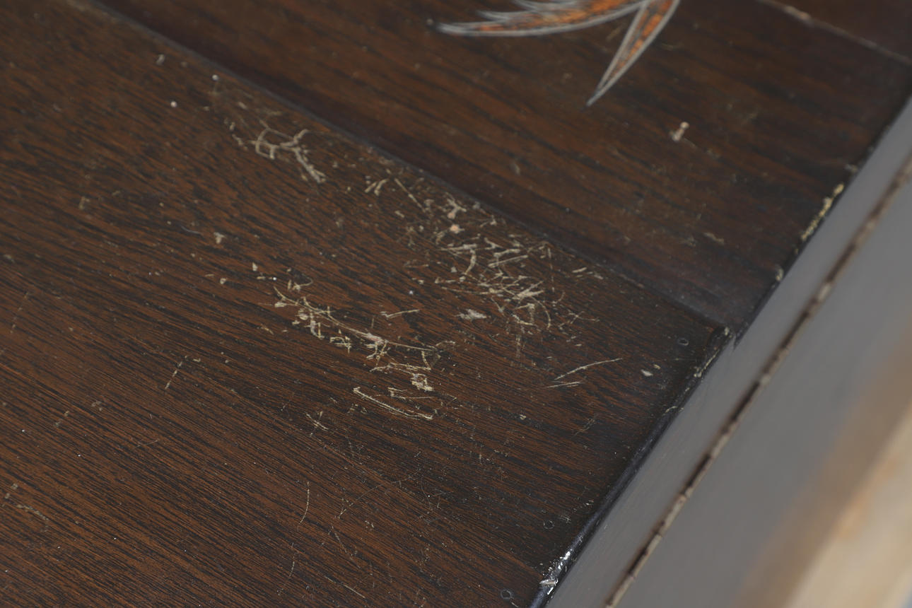 crack to the top, some marks and scratches to the top and in other places, some marks around the legs.