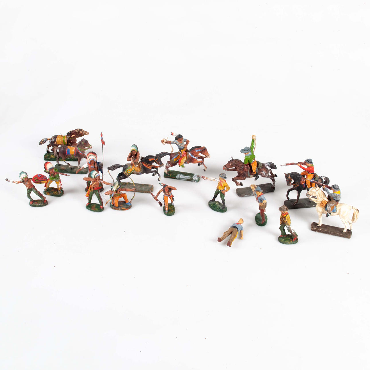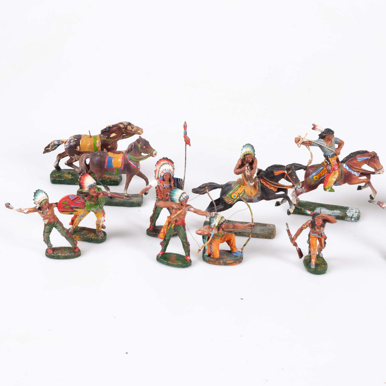 Collection of about 15 hand-painted figures in pulp, depicting cowboys and Indians on foot and on horseback. Typical scenes with bows, rifles, shields and spring screws