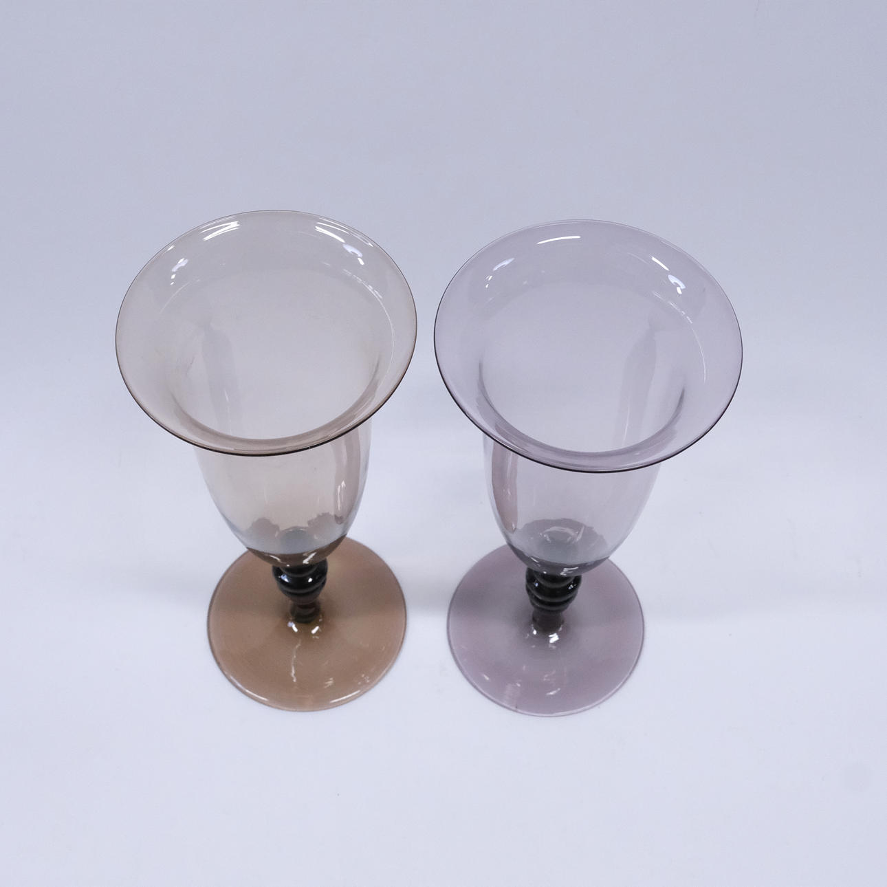 Brown and violet tinted glass, model no 502, circa 1923, height 26 and 25.5 cm.