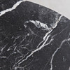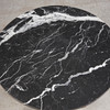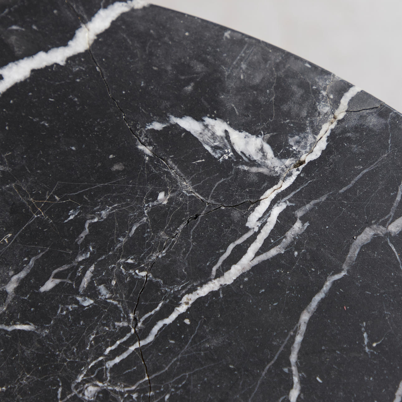 Round side table with metal and brass base set in gold and a black marble table top with white veining, h.49cm, d.61.5cm.