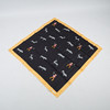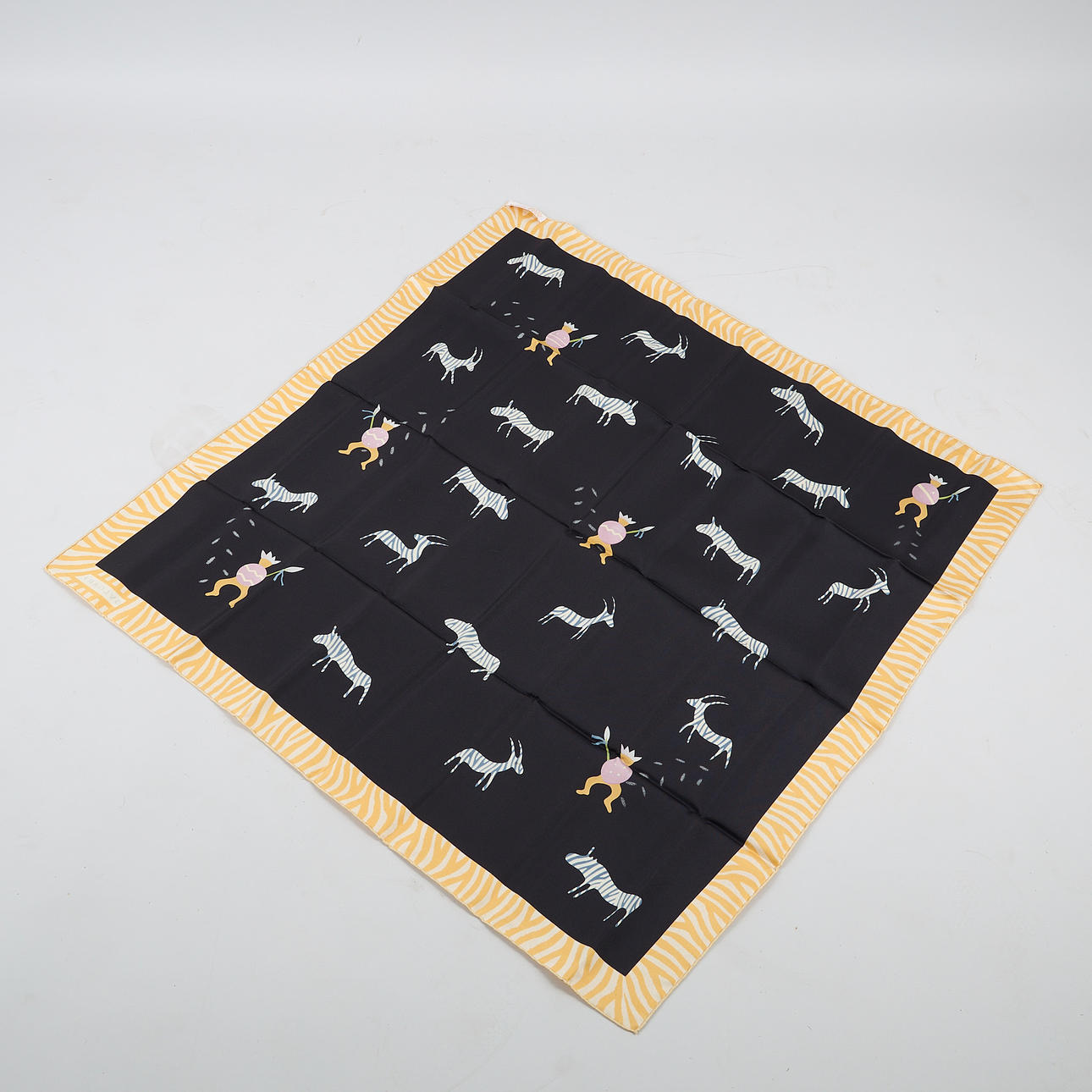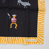 Pattern of animals and figures on black background, patterned border, with tag, approx. 85 x 85 cm.