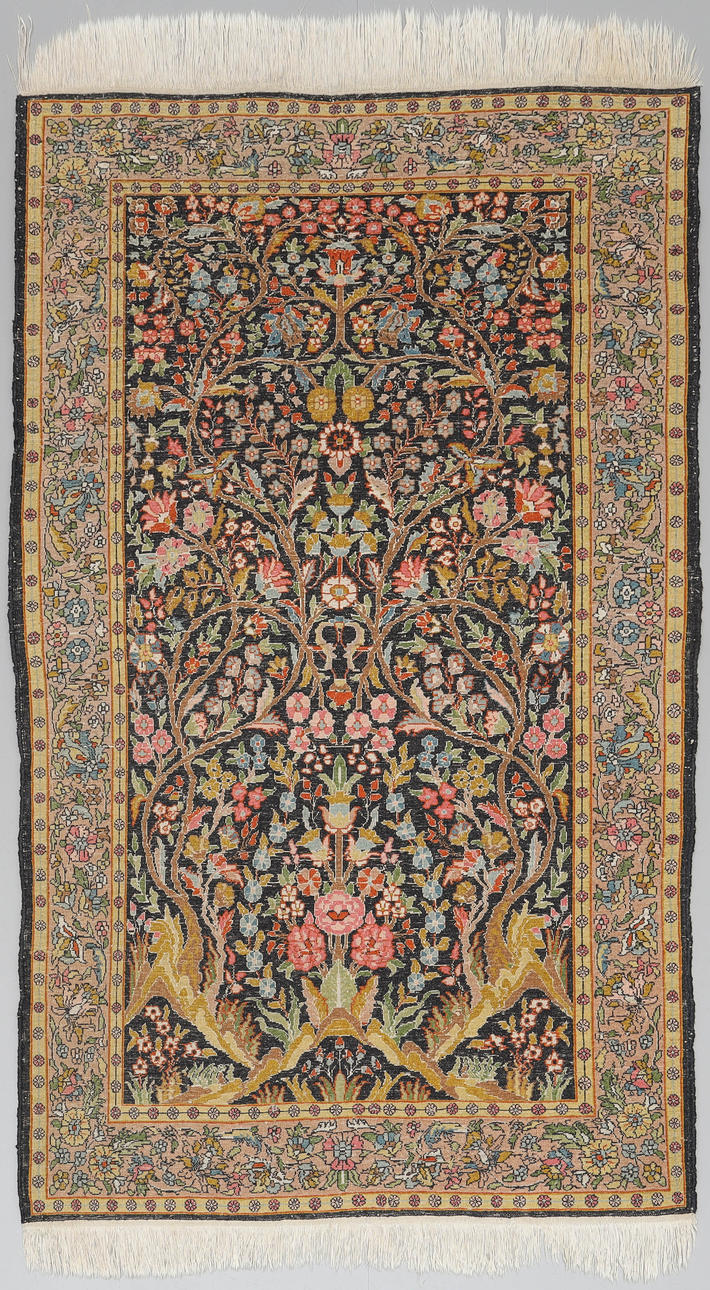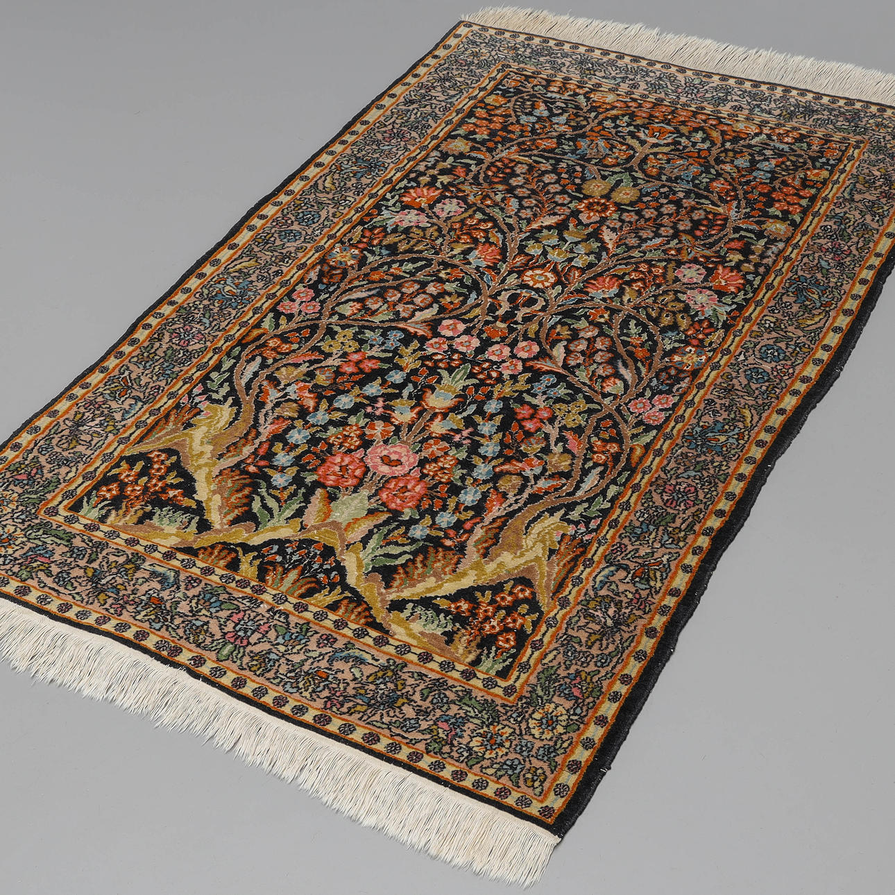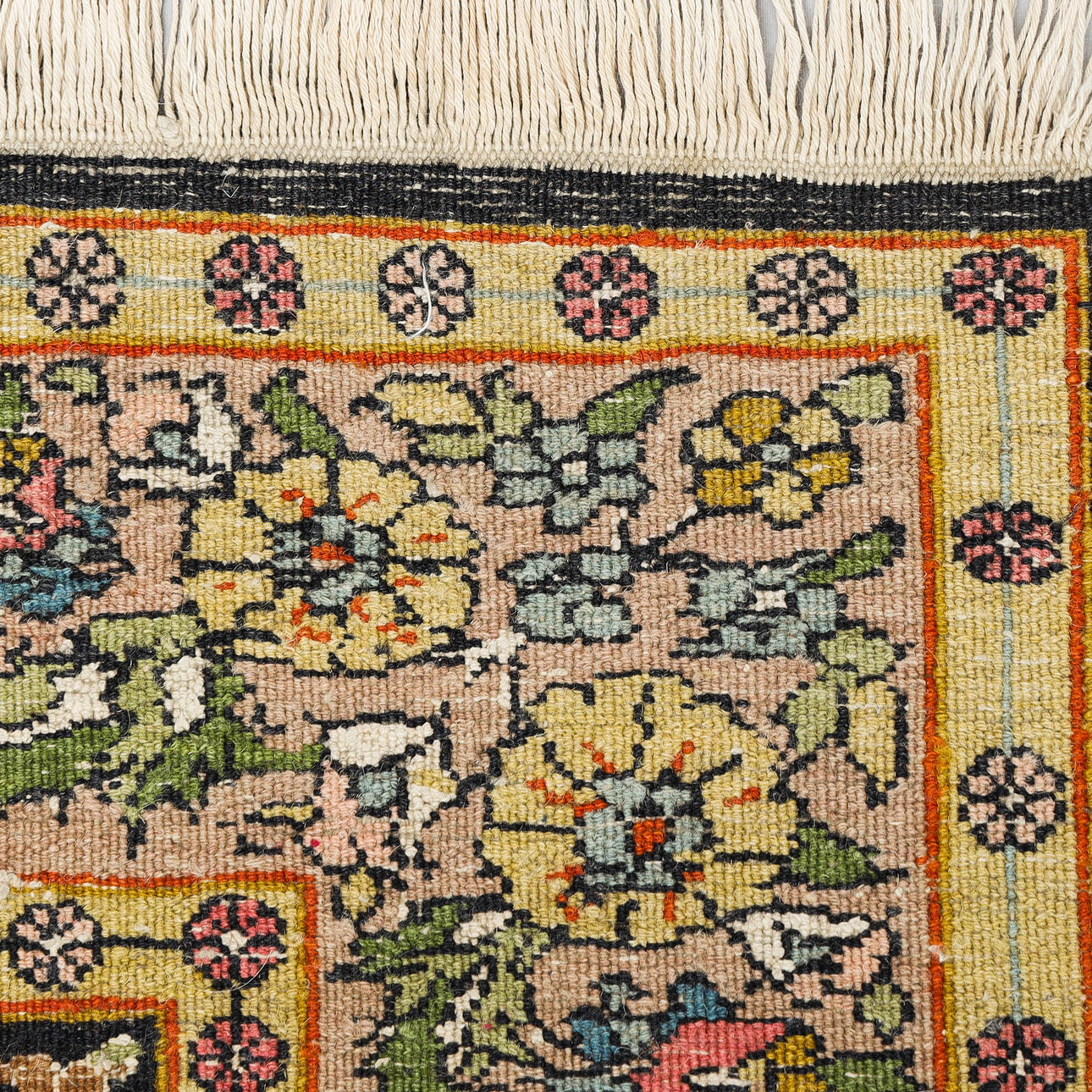 Normal wear and tear, fringes partially worn.