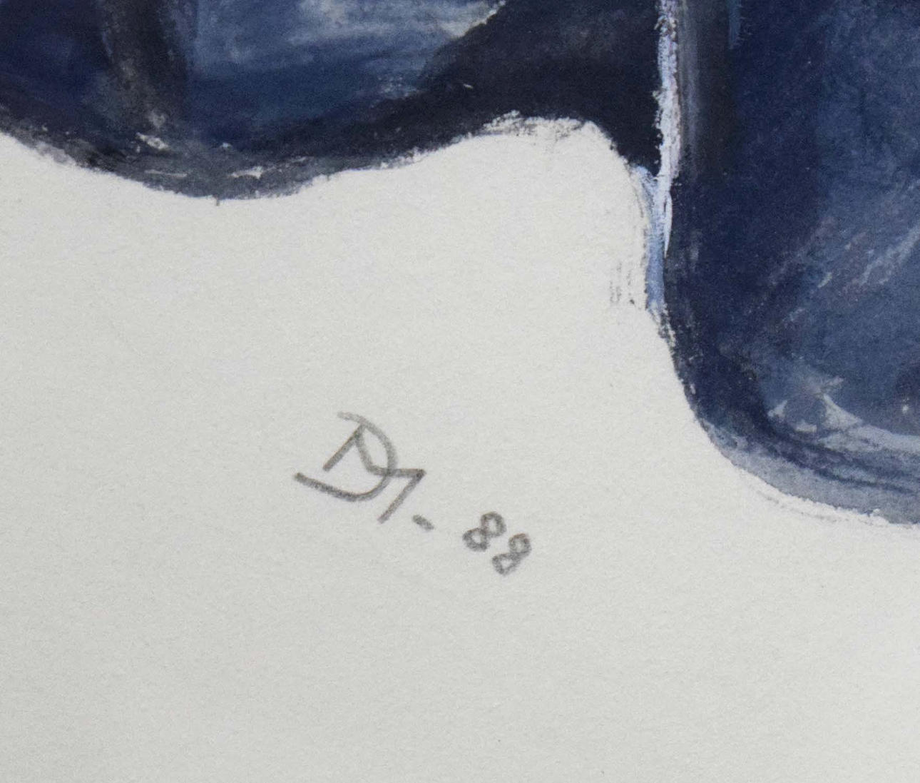 Flowers in ribboned glass fish bowl on deep blue cloth, initial of artist and date 'DM 88', gallery label on verso, framed, mounted and glazed, 83 cm H x 73 cm W.