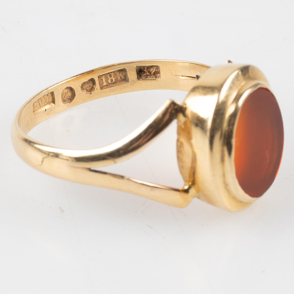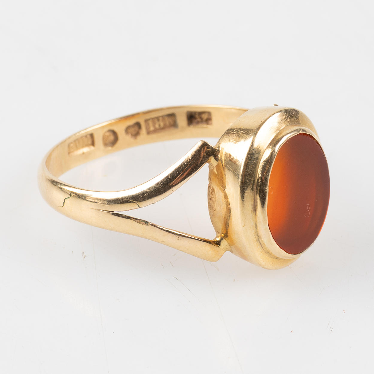 Framed with carnelian. Stamped Erik Viktor Mandahl, Helsingborg 1912. Ringstrl. about 20.25 mm. Weight about 4.6 grams.