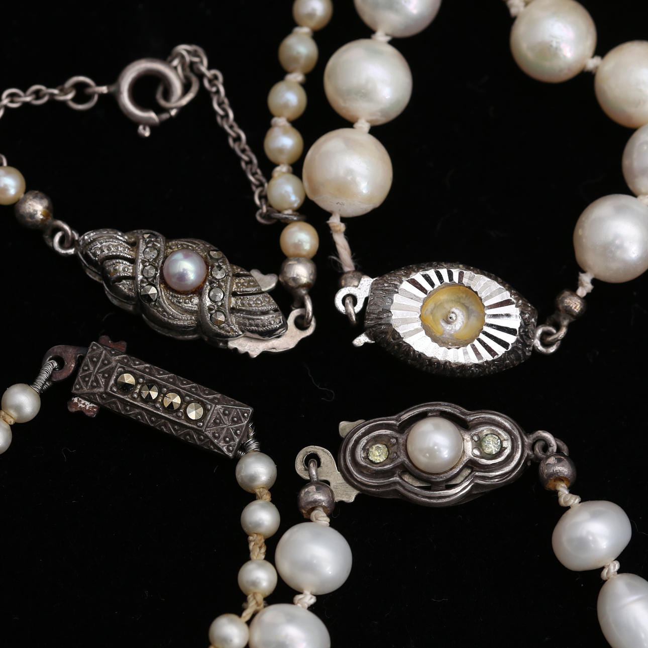 PEARL NECKLACE, 4 pcs with silver buckle.