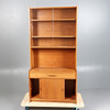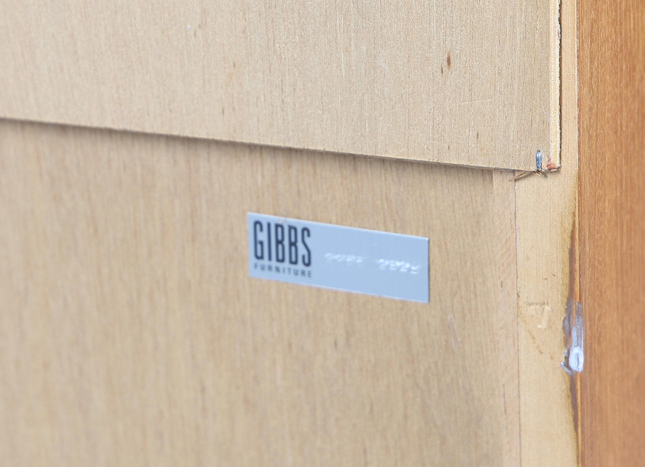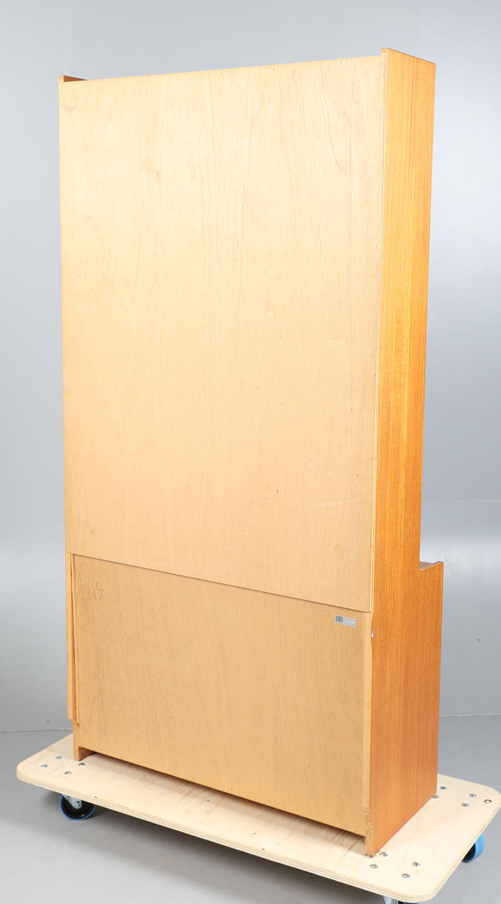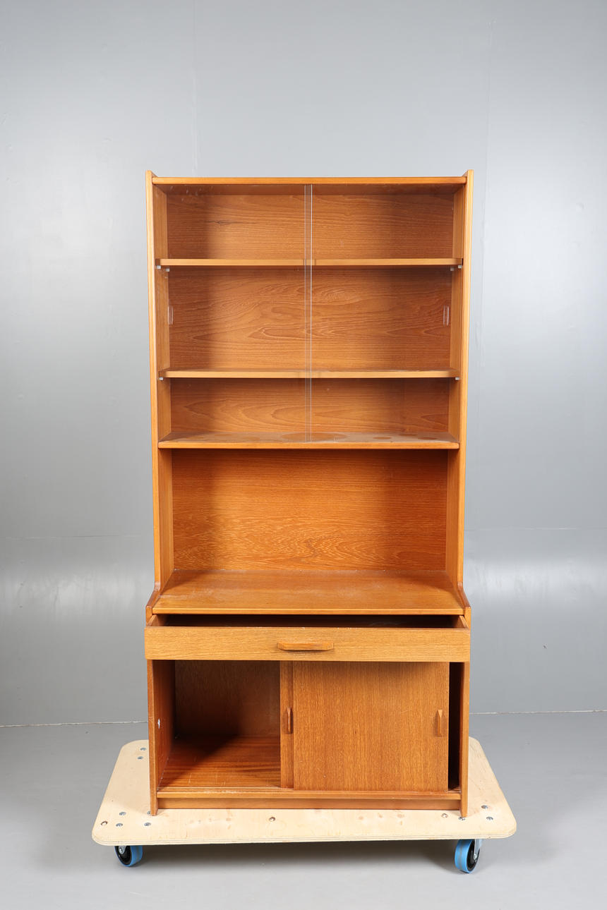 The 20th Century teak bookcase with glass sliding doors revealing adjustable shelves above a single long draw and twin sliding doors, label to the reverse, 183cm height, 91cm width, 41cm depth.