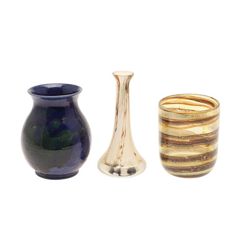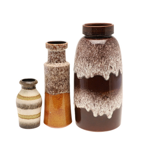 comprising of a pair of two handled vases decorated with parrots, 25cm high, a Widdecombe Fair jug and preserve pot, and a milk jug; together with a set of eight Artone miniature pottery character jugs, 10cm high.