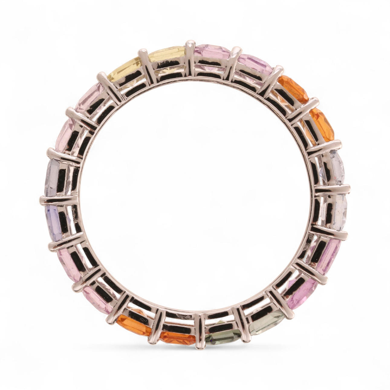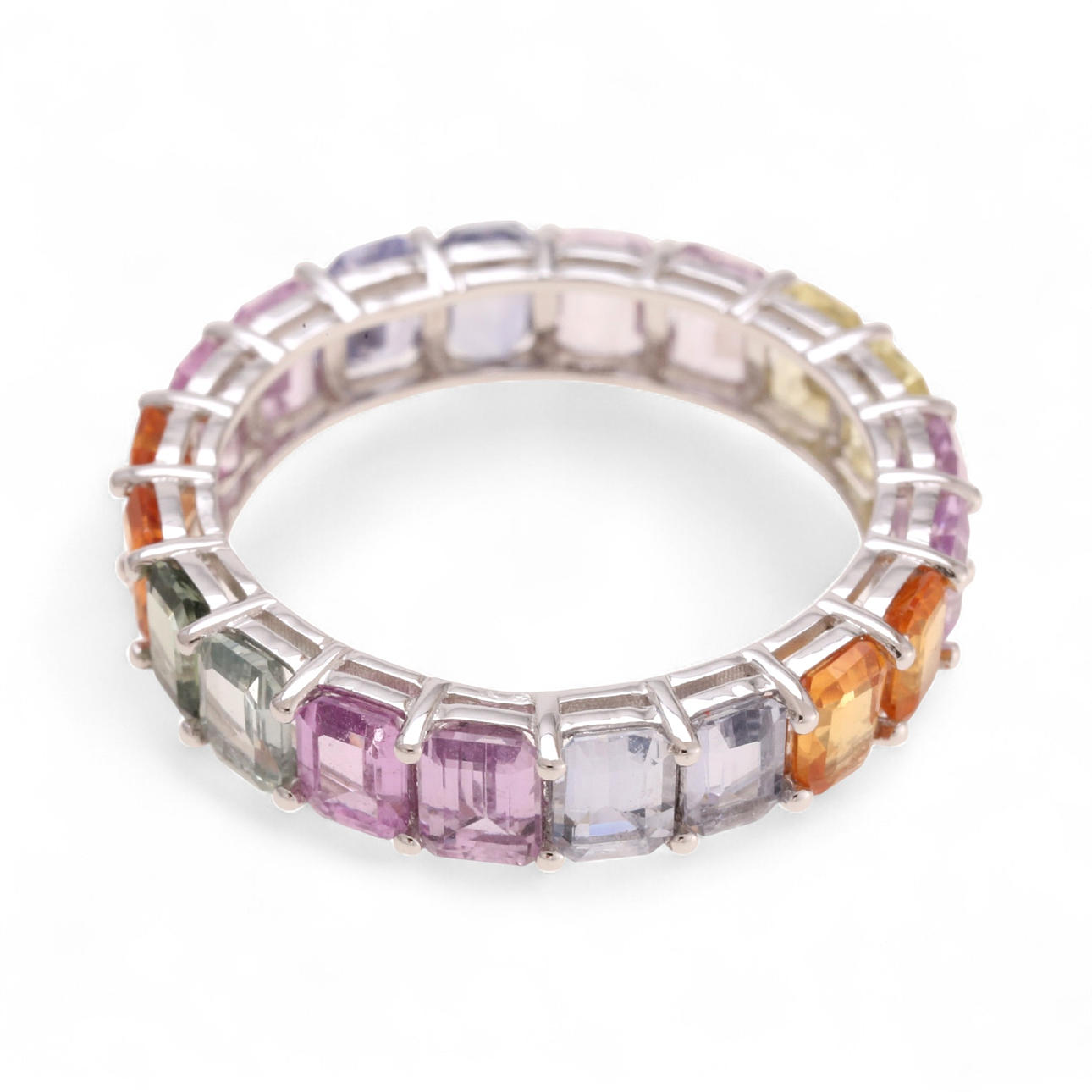 18K white gold and emerald cut coloured sapphires, approx. 5 cts. Size 13/53. 2.6 gr.