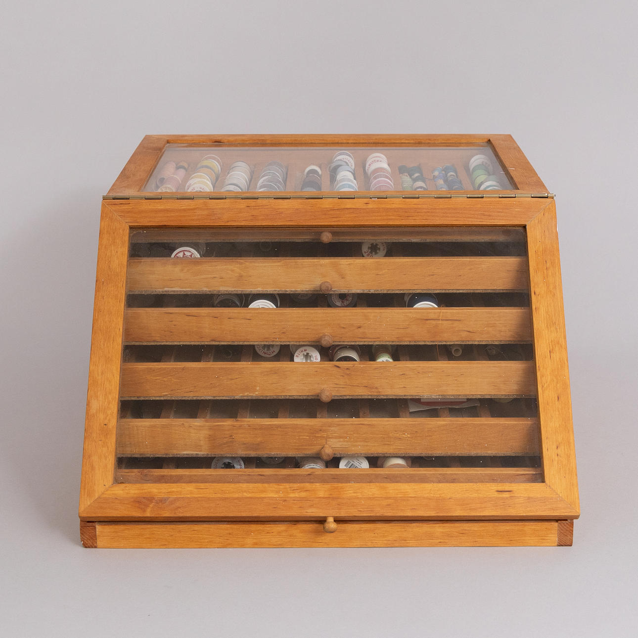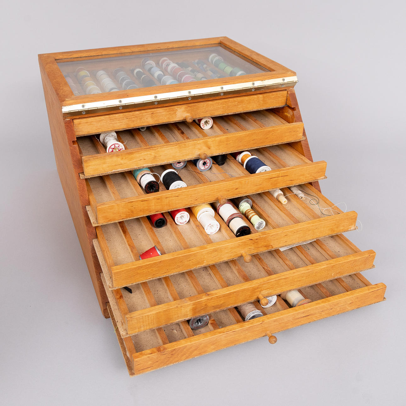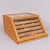 Glazed display case with five compartmentalized pull-out drawers.