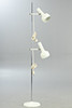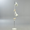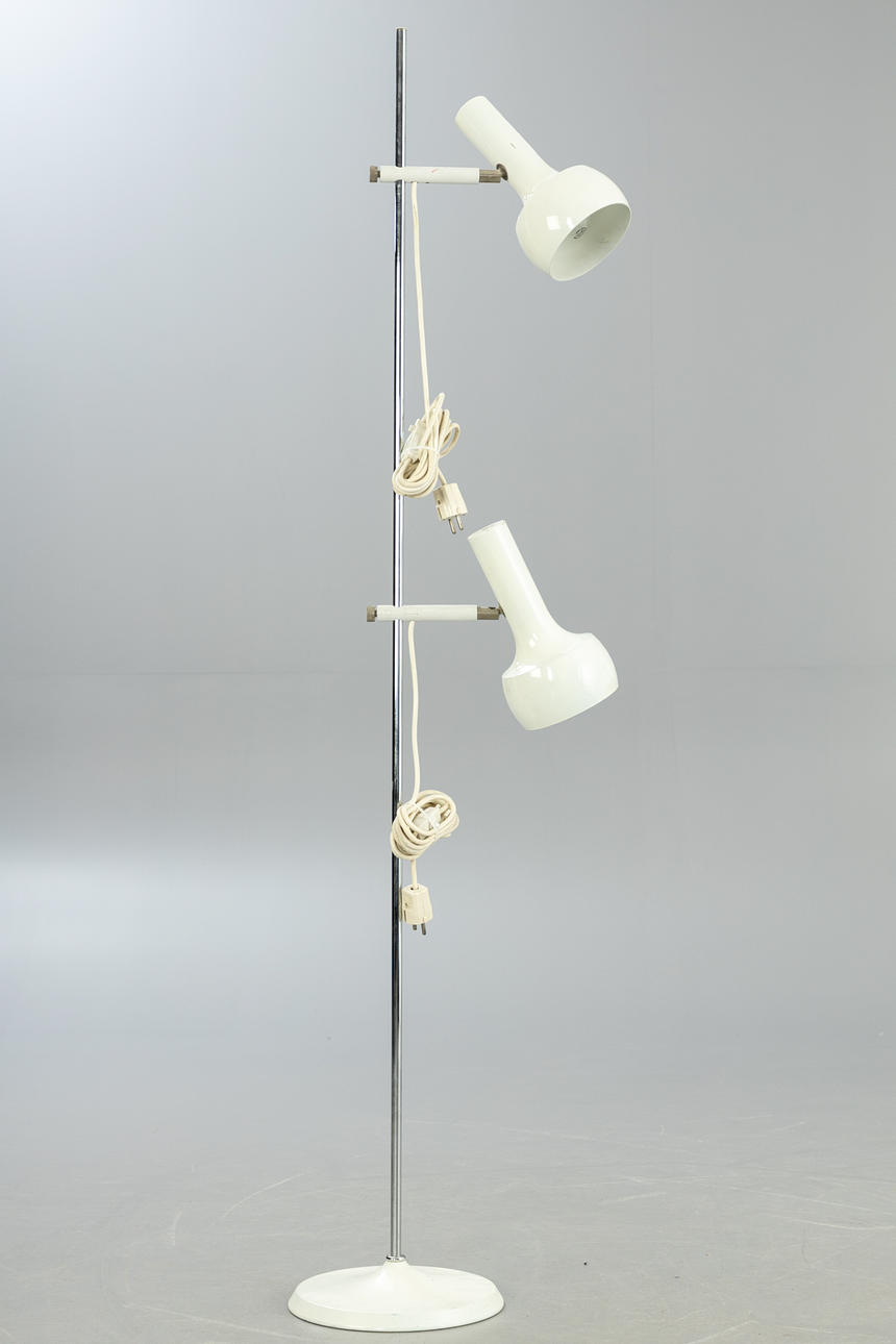 Metal frame, chrome-plated lamp stem, white lacquered lampshades and stand. 2 spotlights, height-adjustable and adjustable.