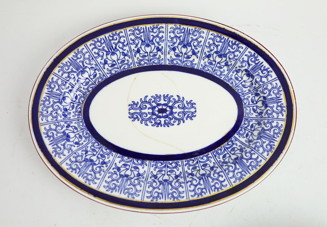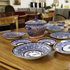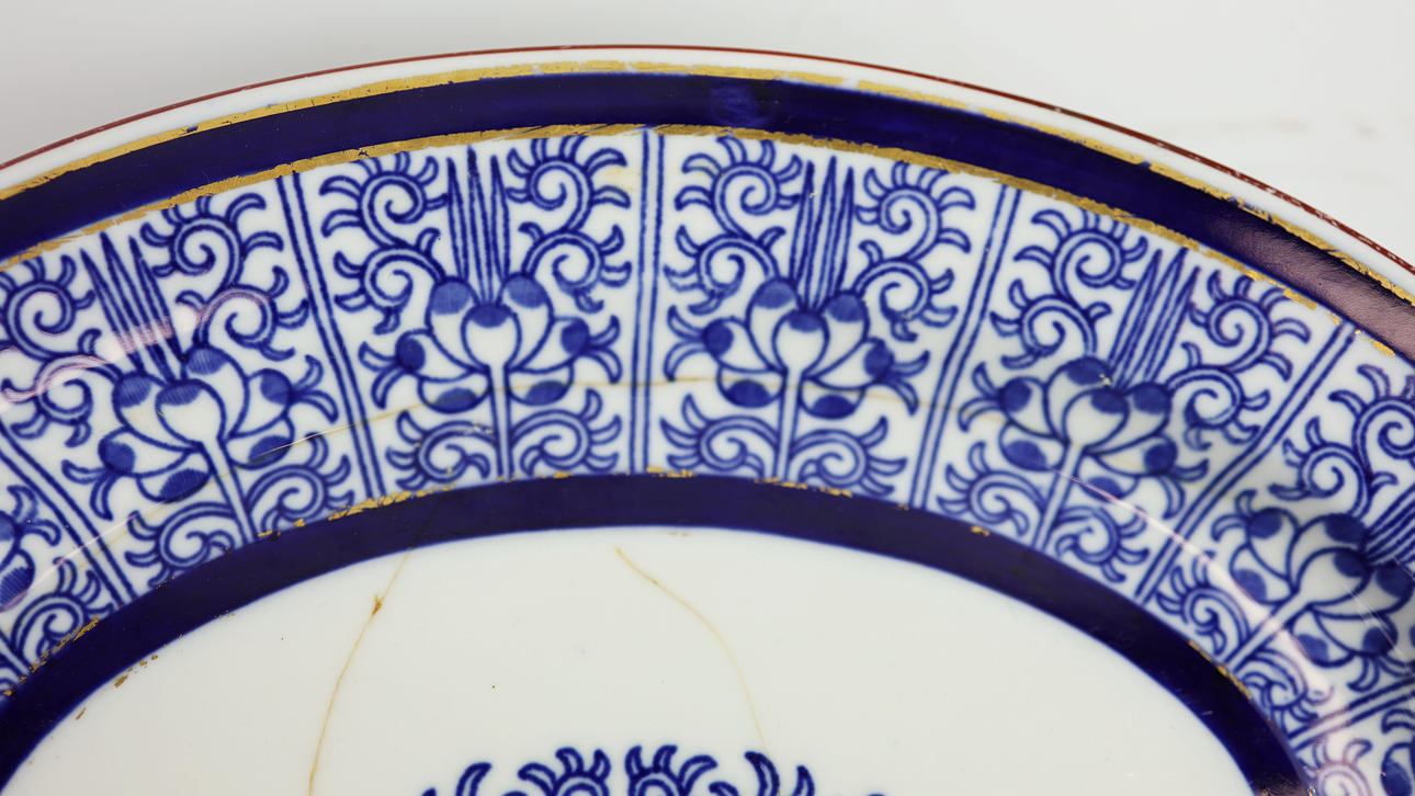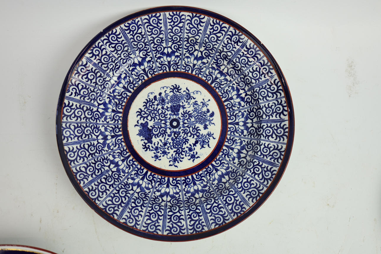 including a jug, saucers and plates along with a 'clobbered' ware plate and tureen. tureen 37cm L.