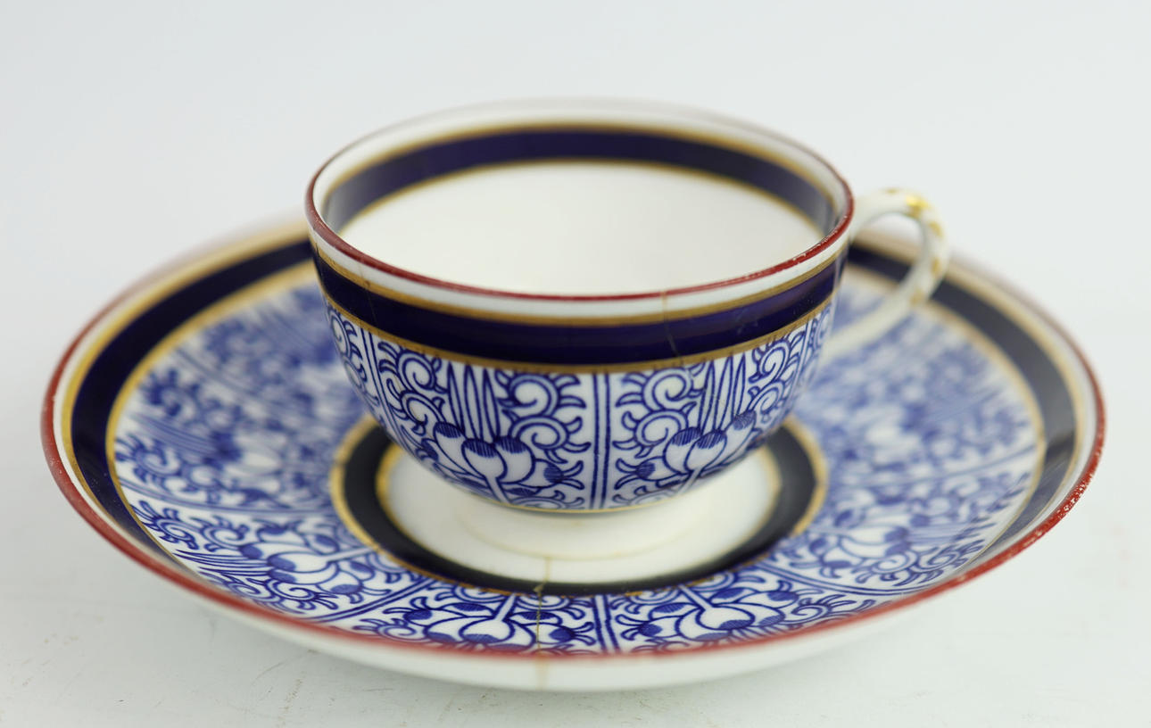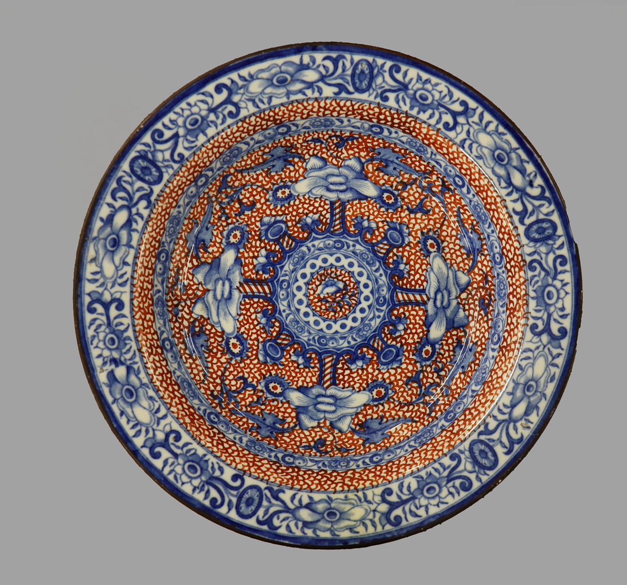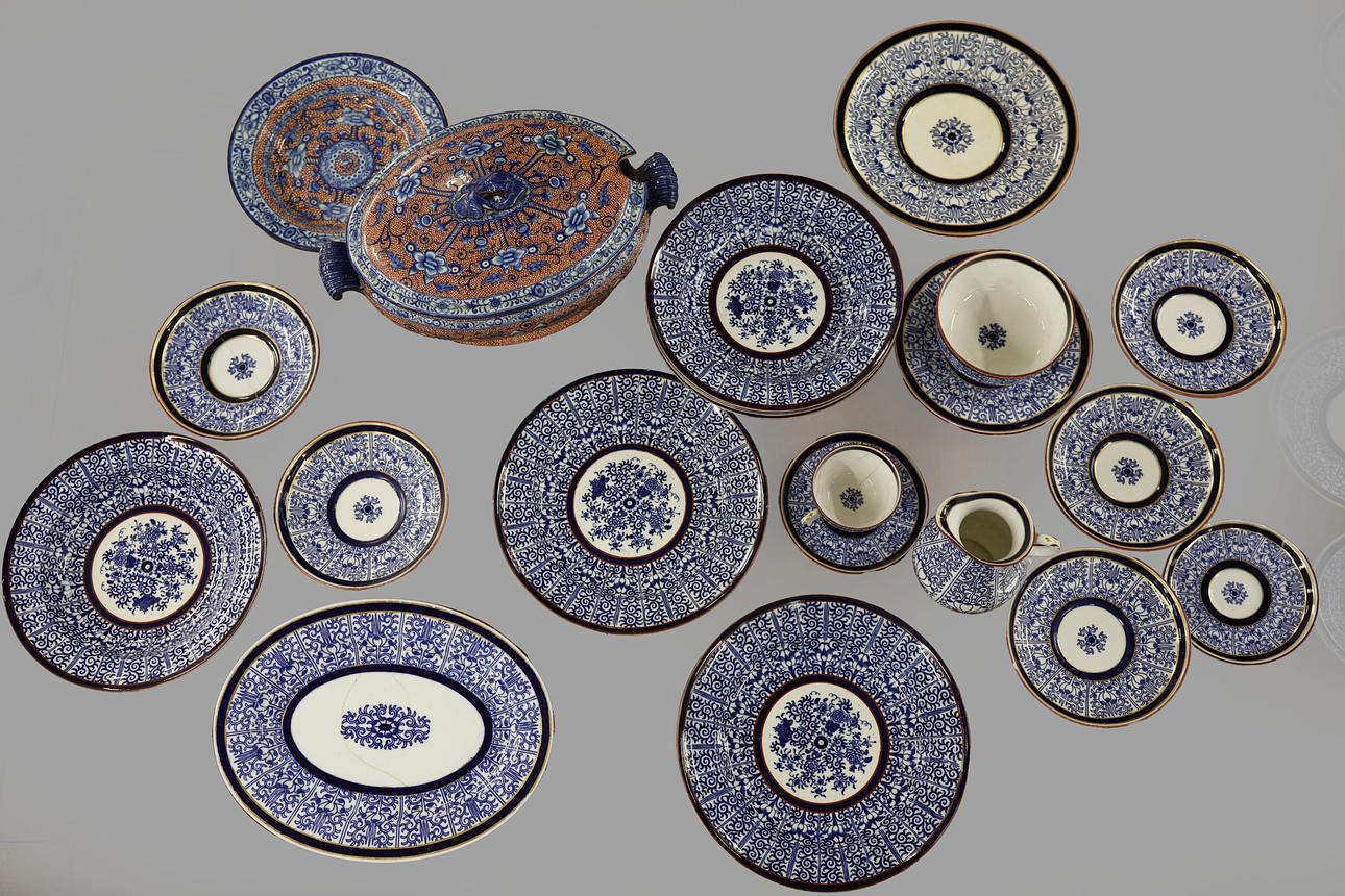 including a jug, saucers and plates along with a 'clobbered' ware plate and tureen. tureen 37cm L.