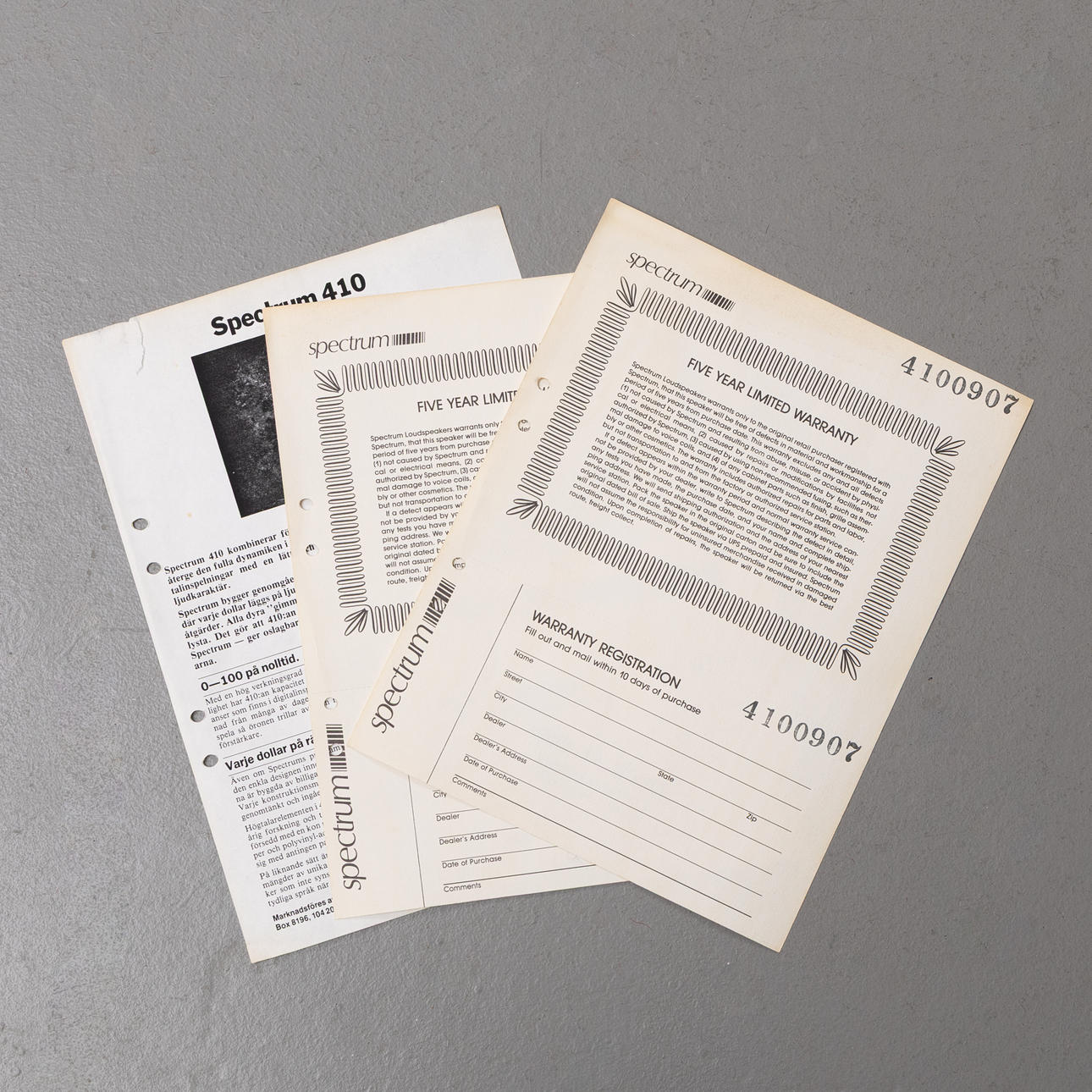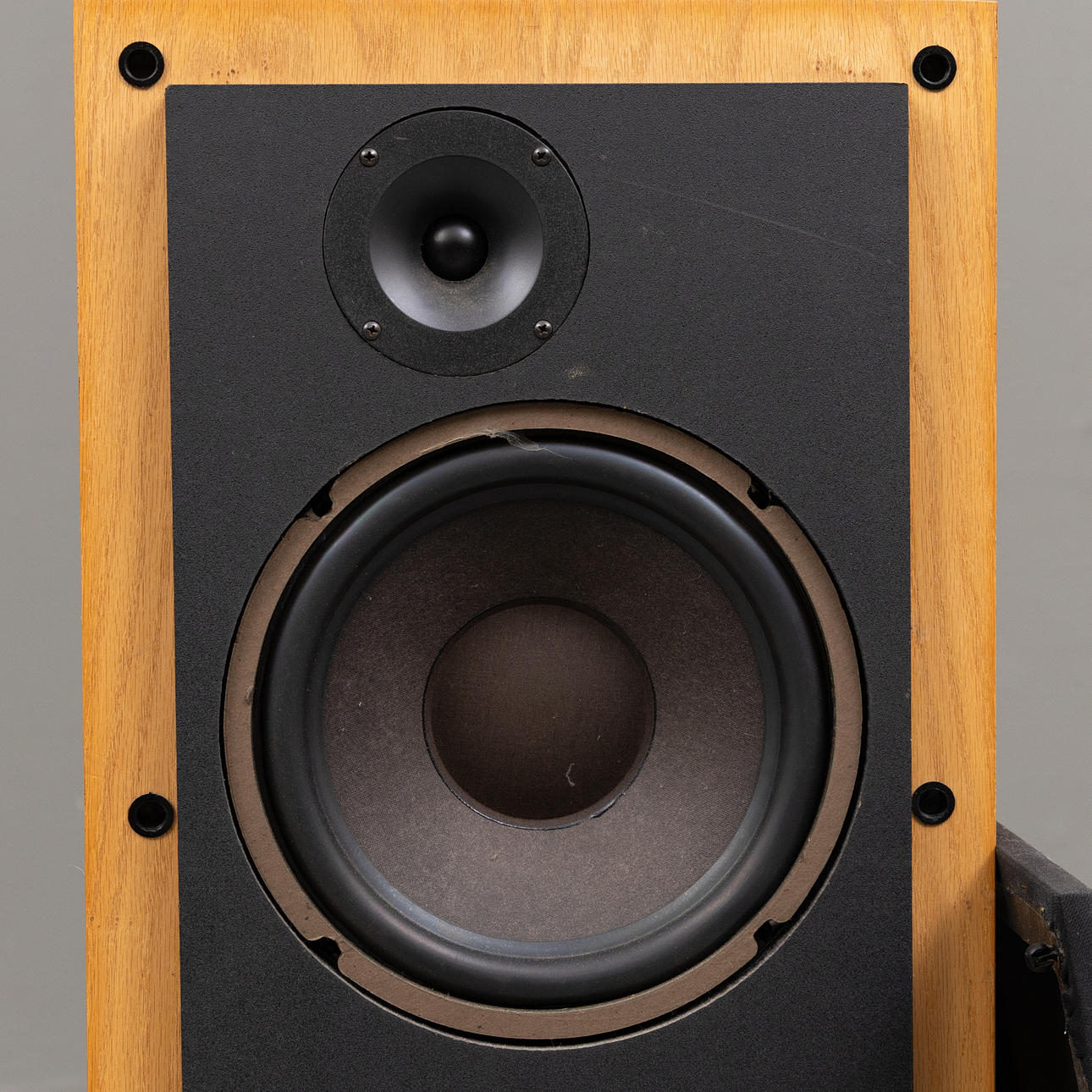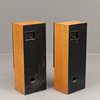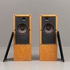 Spectrum 410 speakers. two-way construction in veneered cabinets. Textile-clad element protectors, badged.