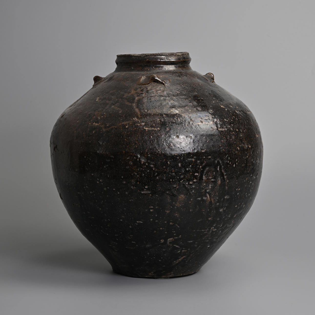 Of ovoid form with four handles to the shoulder on a slightly concave base. 14th - 15th century. 29cm tall.