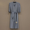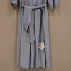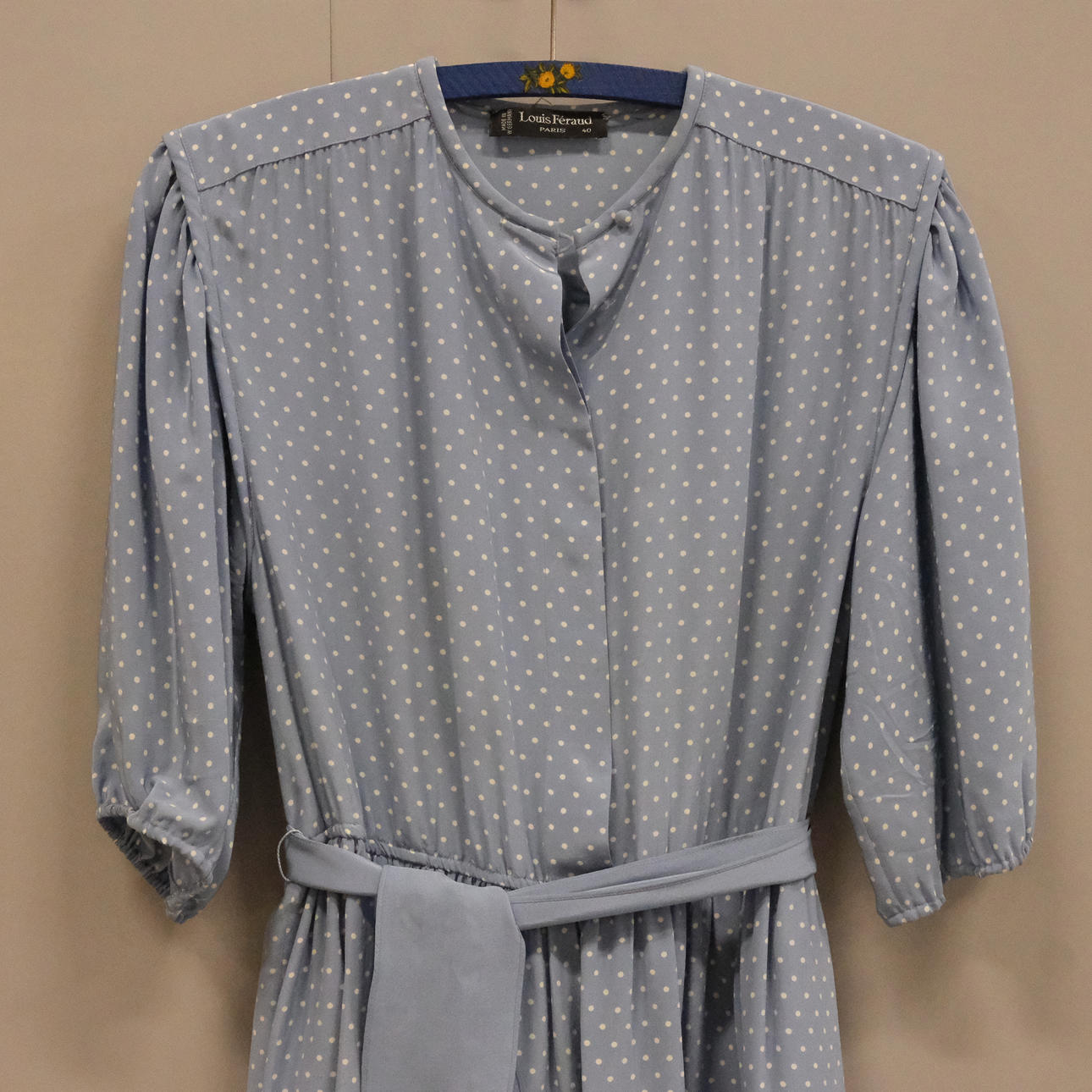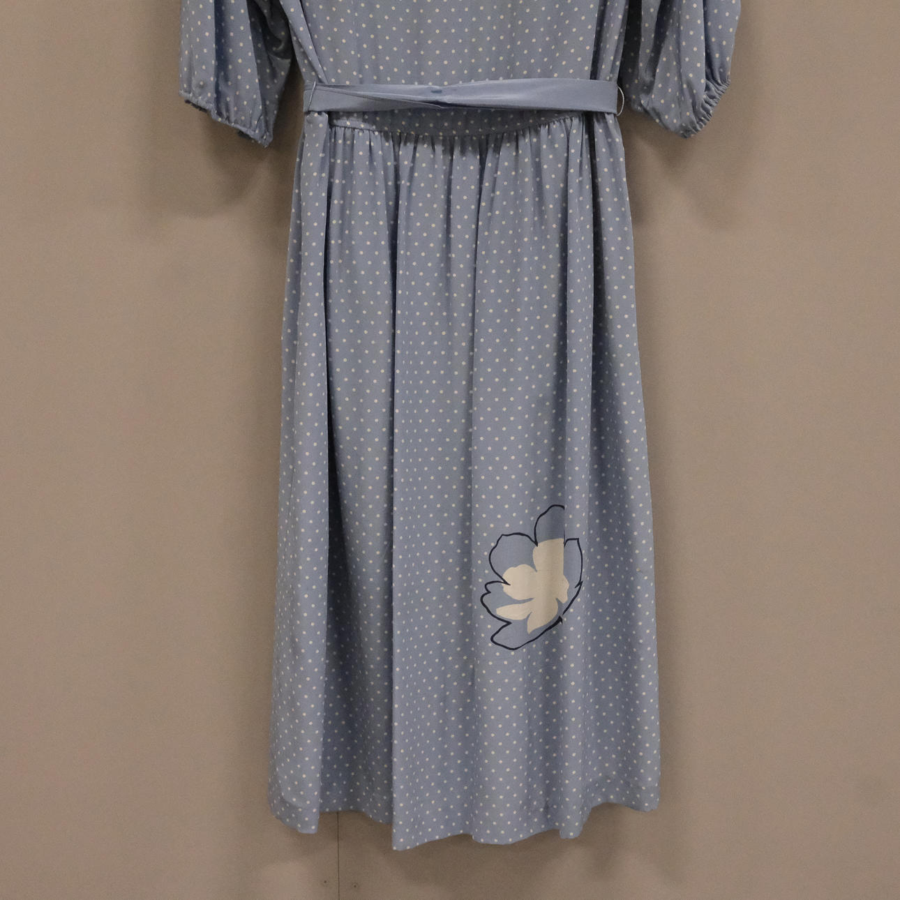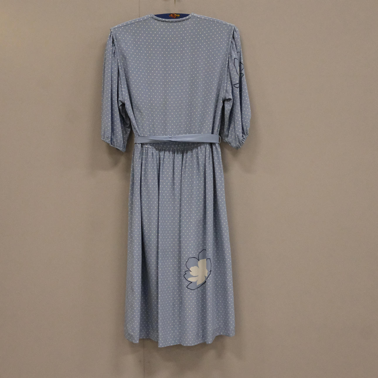 Synthetic material, light blue with white dots and leaves in white and black, sash, buttons at the top, Size 40, made in West Germany.