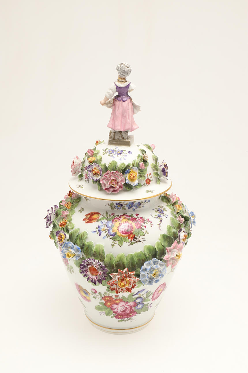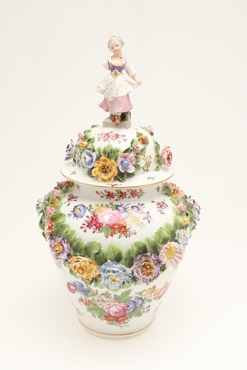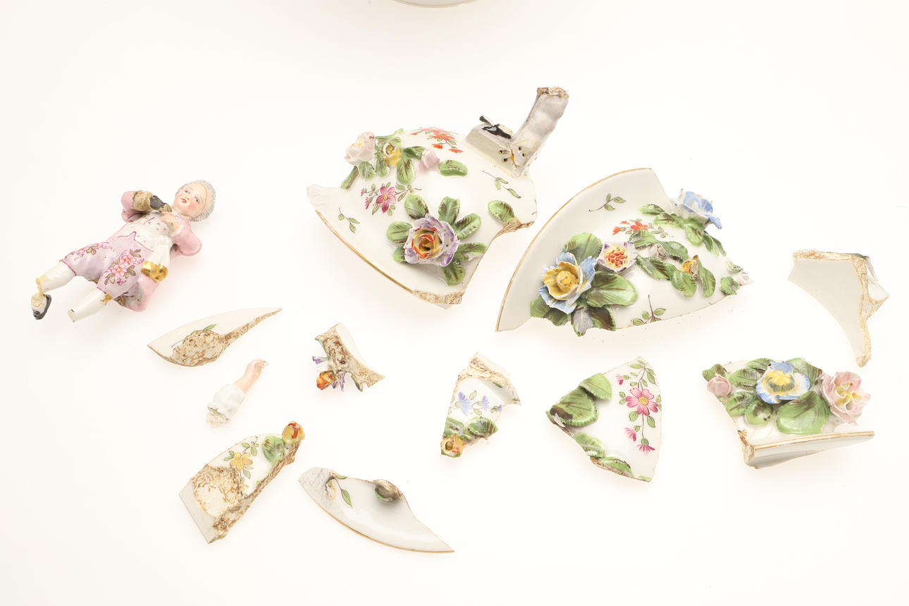 One lid completely smashed and in pieces, the other lid with damages to the lady and restoration, chips to the flowers.