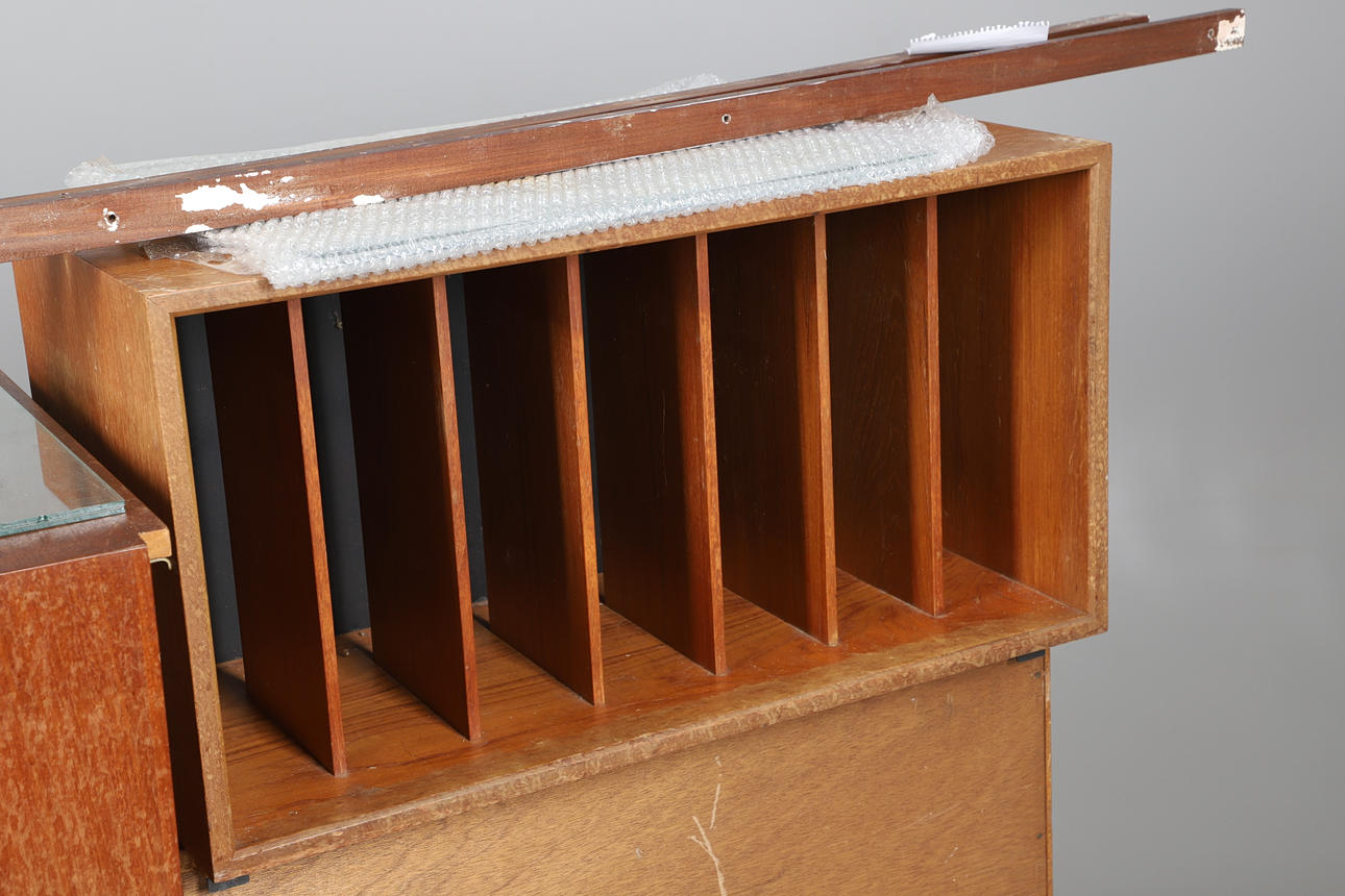 To include shelves, cupboards and other rectangular storage units of varying design, together with various fixtures and fittings etc. Sliding door cupboard measures Height 43cm x Width 80cm x Depth 35cm.