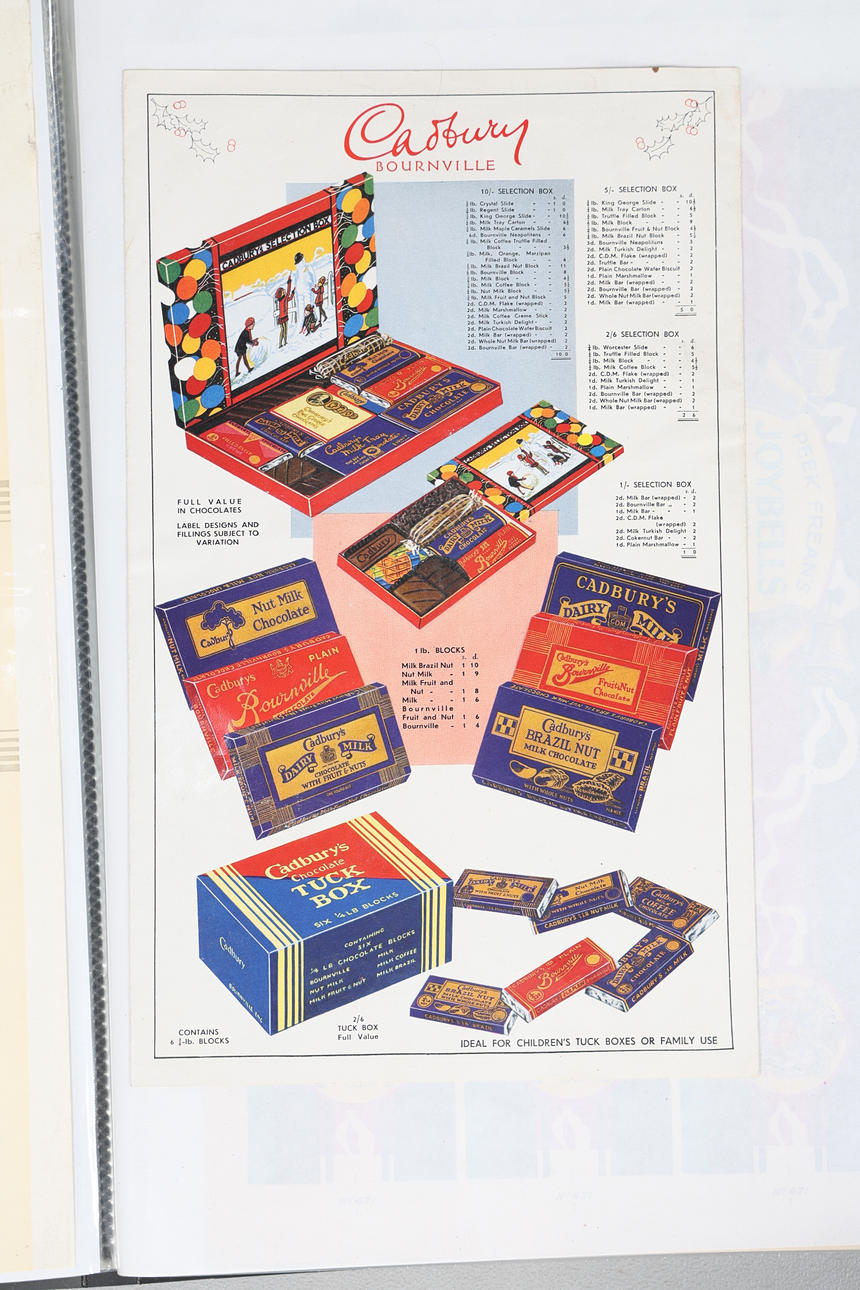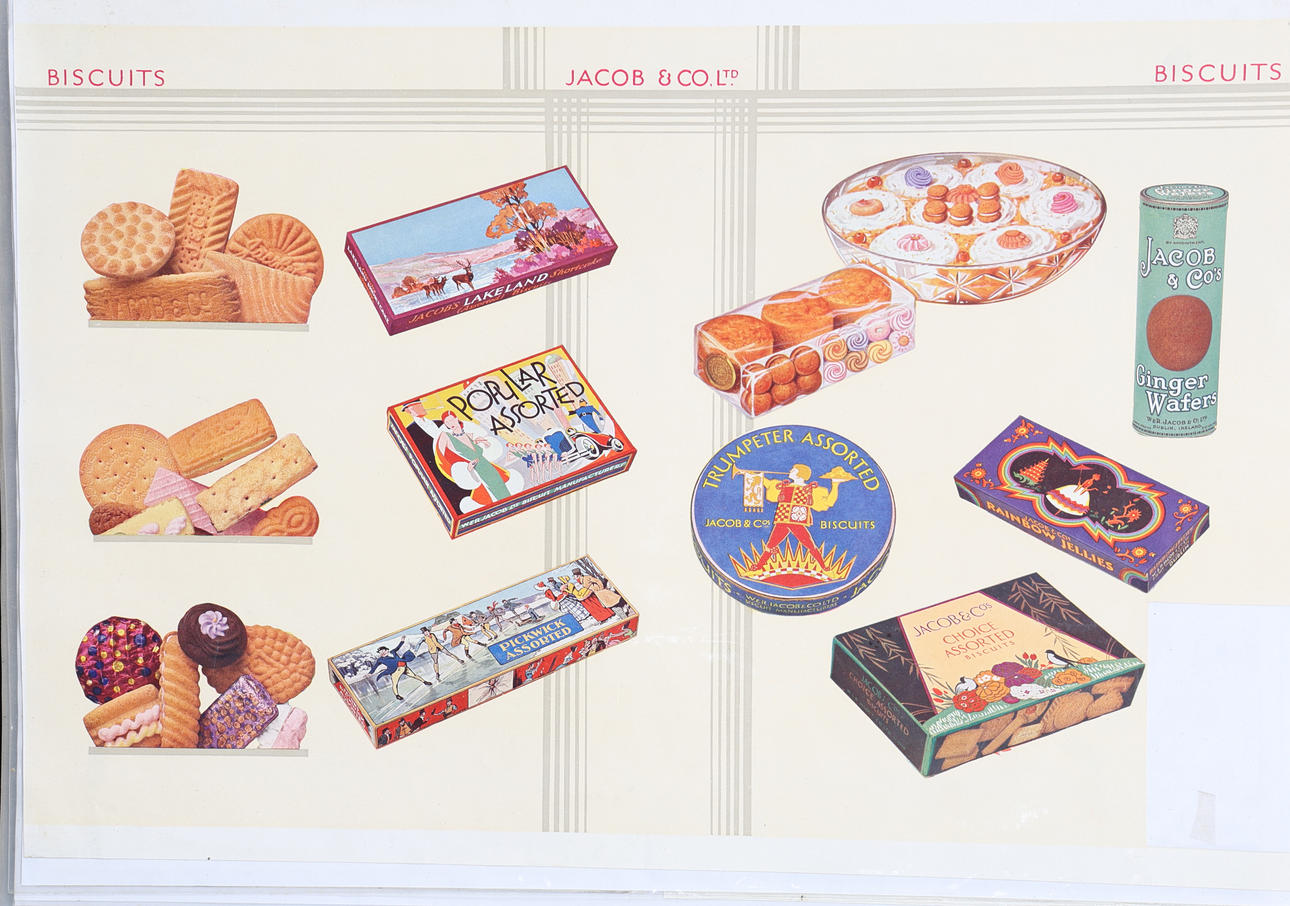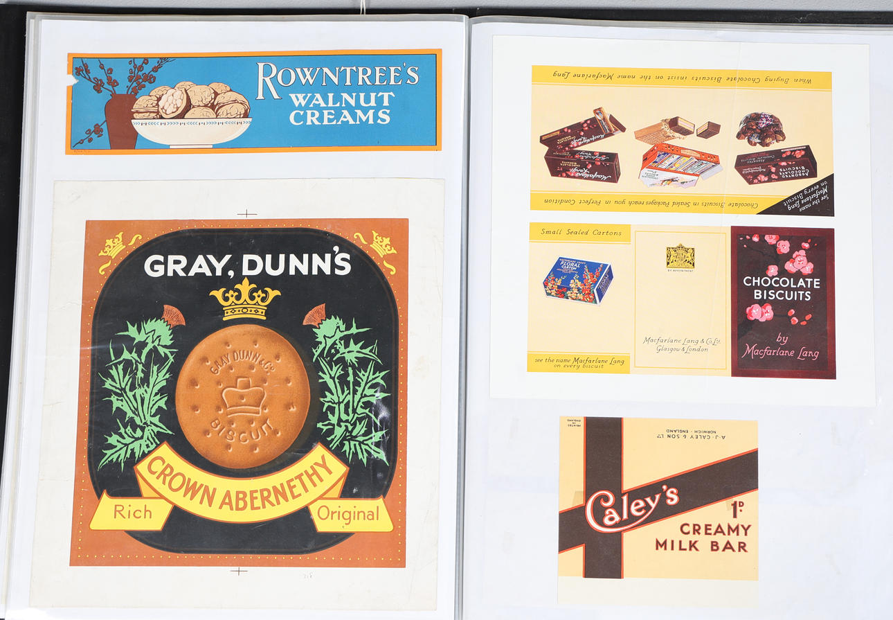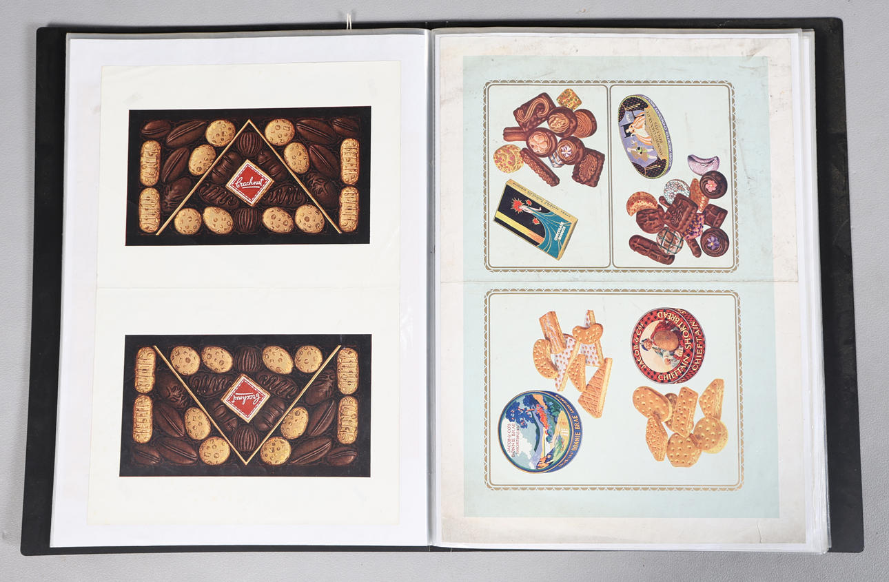 Coloured prints, to include Huntley & Palmers, Jacob & Co., MacFarlane Langs Biscuits, Cadbury Bournville etc., the folio 33cm wide, 44cm high.