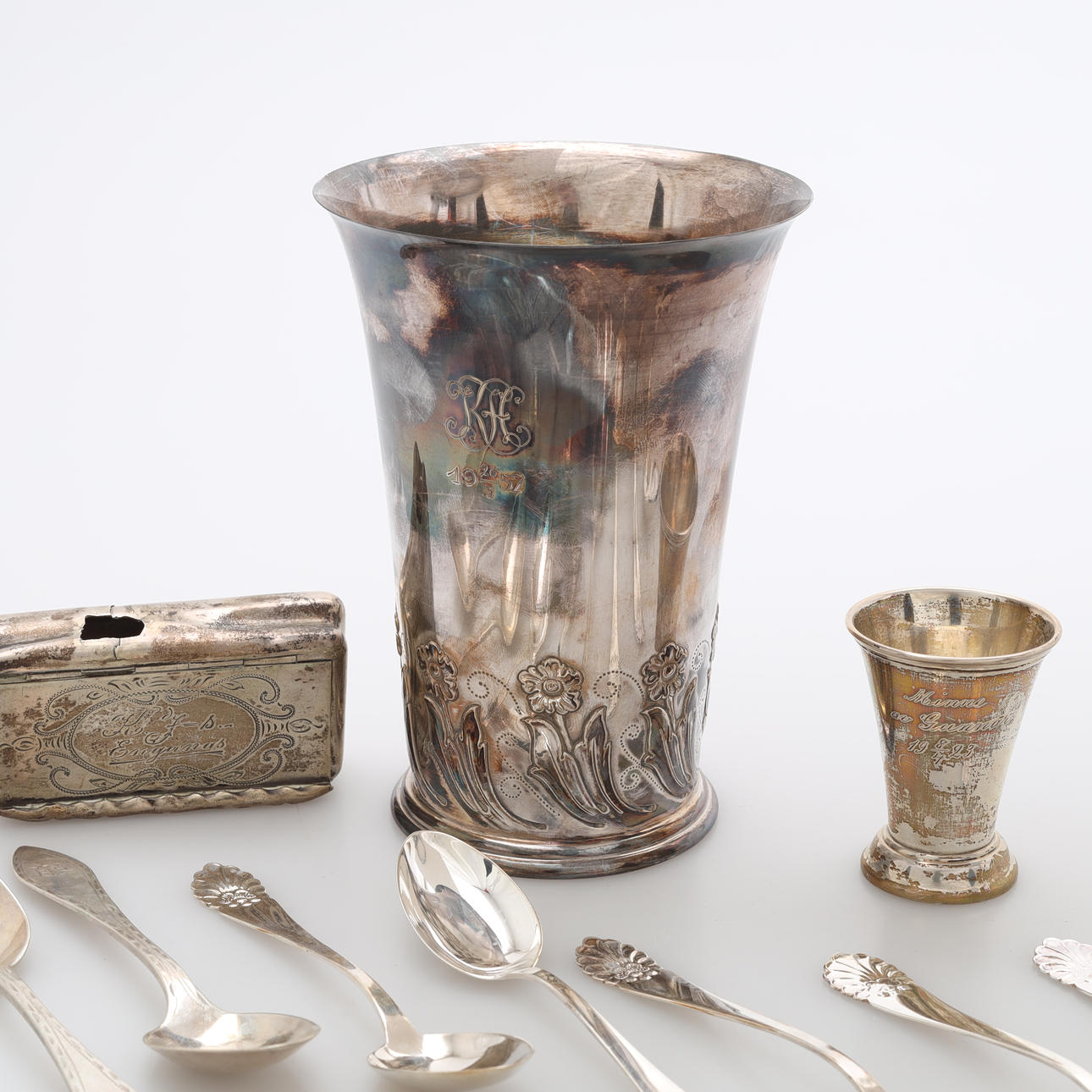 Vase, spoons, can, soup cup. Vase height 13,5, diameter 10 cm.