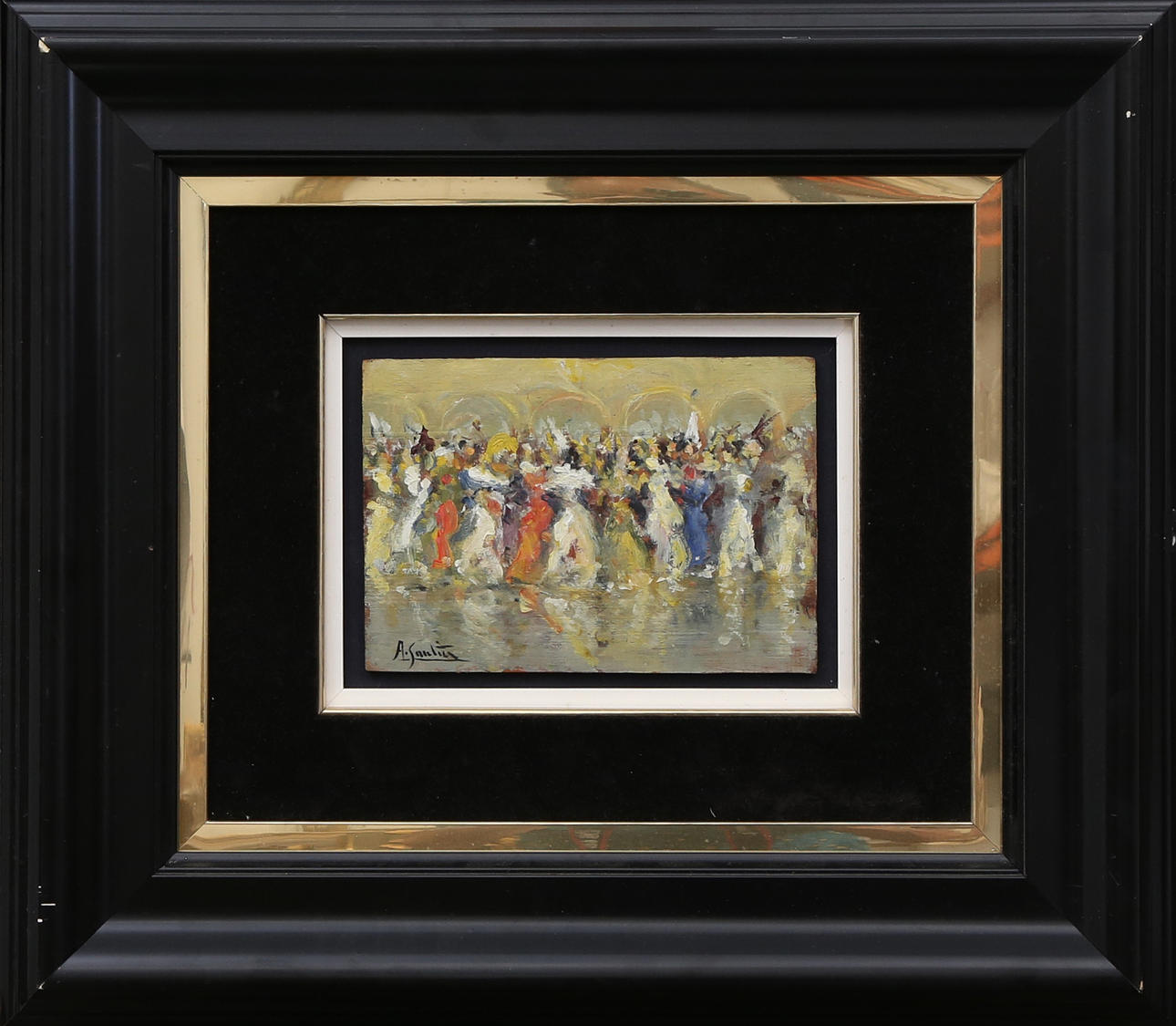 Slight flaws on the paint layer. Lacquered wood and stucco frame, with defects. Passe-parotut in black velvet.