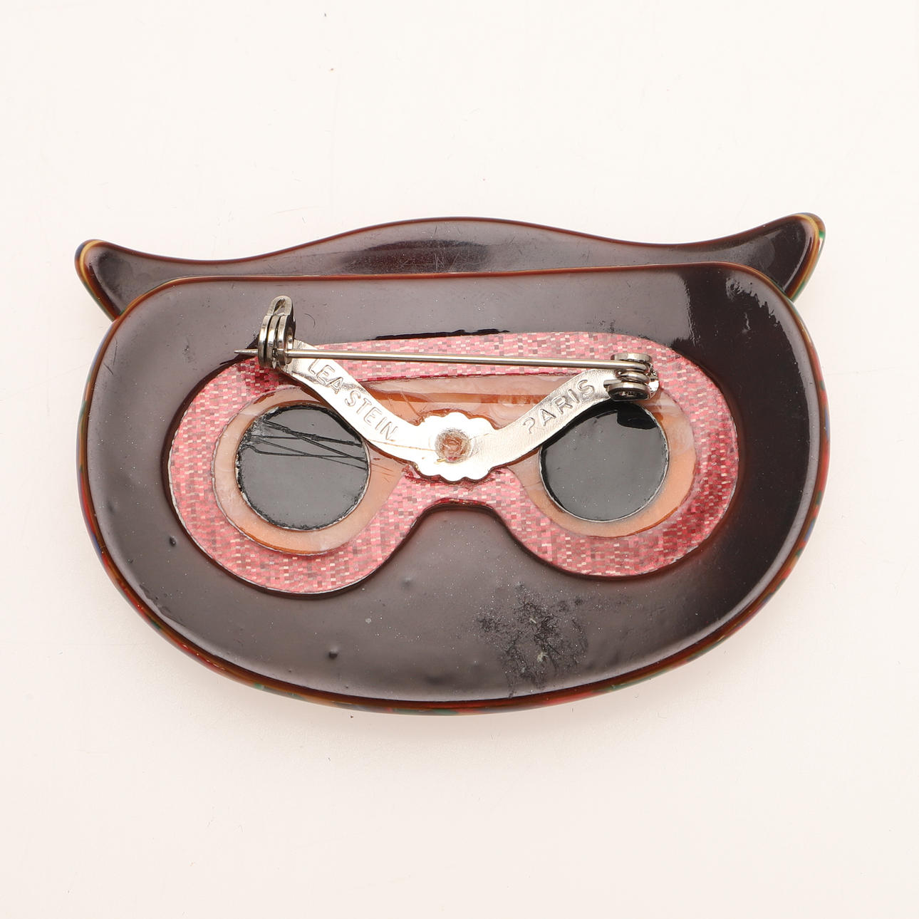 A Lea Stein celluloid brooch of an owl, pin marked Lea Stein, 6cm wide.