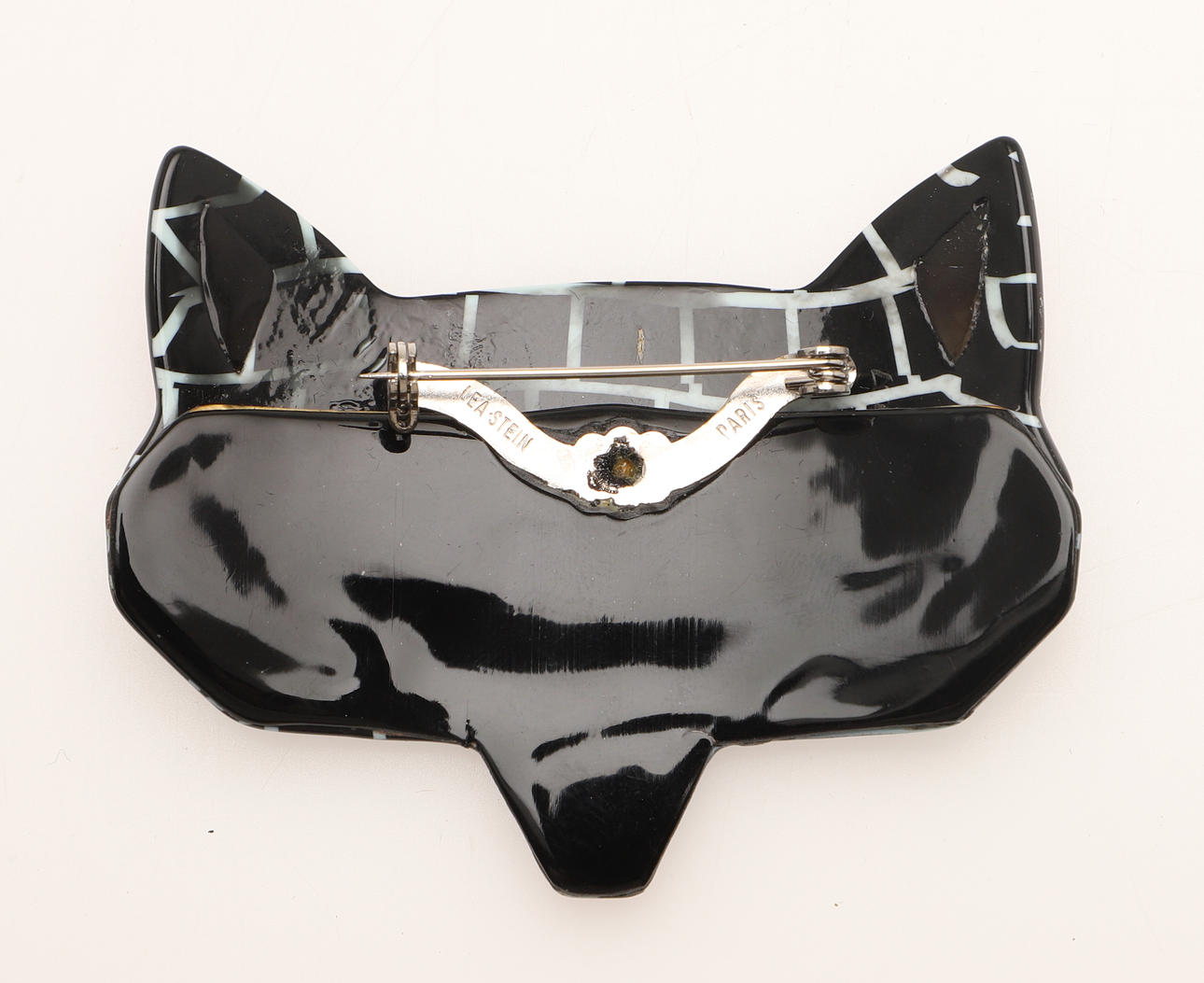 The Lea Stein celluloid brooch of a black fox mask with red eyes, pin marked Lea Stein, 6.5cm wide.