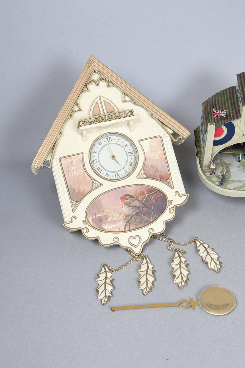 To include two cuckoo clocks, 40cm high approx., and an RAF clock, 23cm high (3).