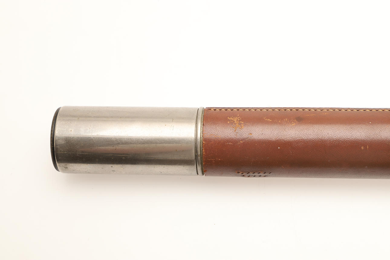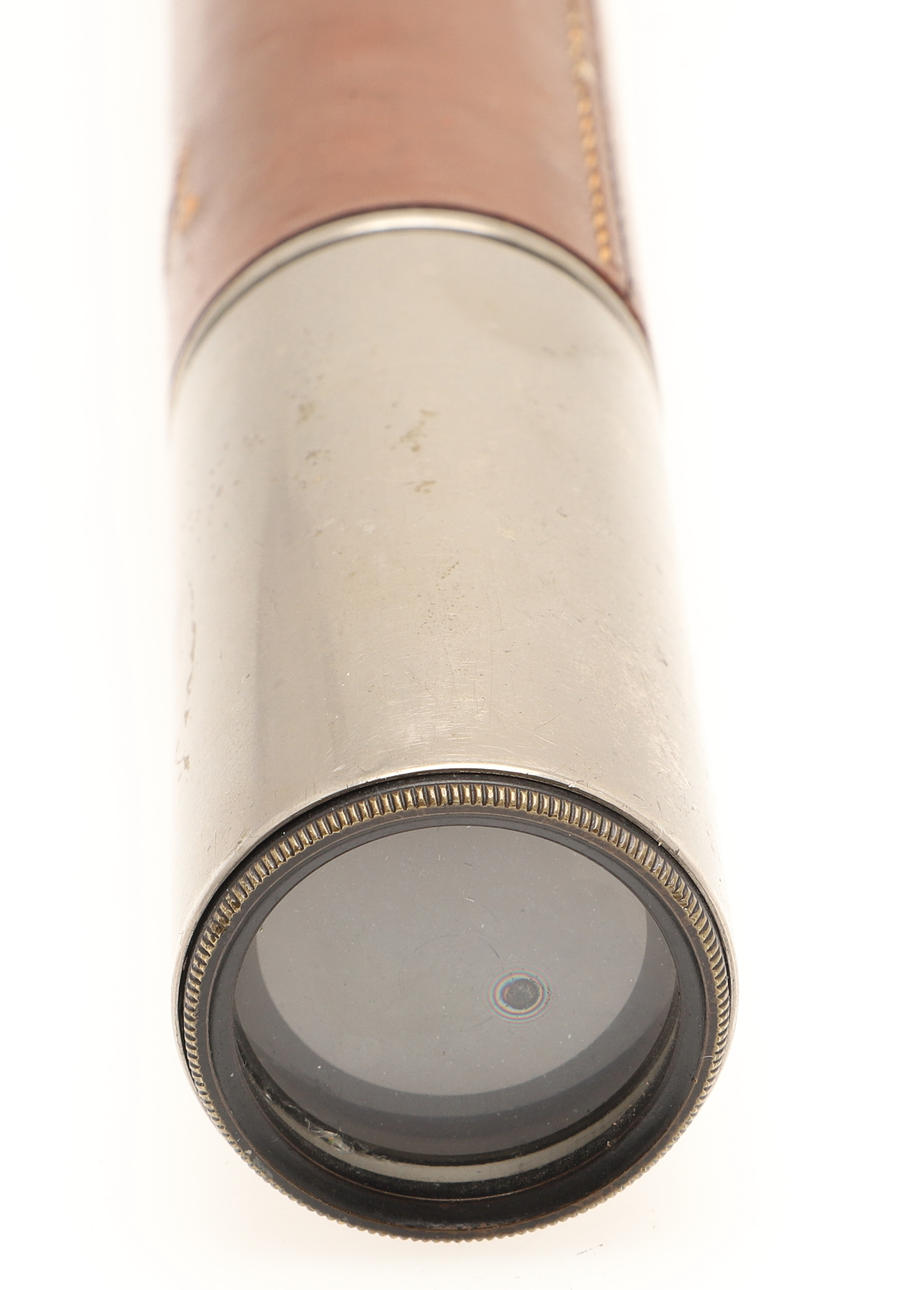 A one drawer chromed metal telescope with leather grip, no makers name. 60cms long fully extended.