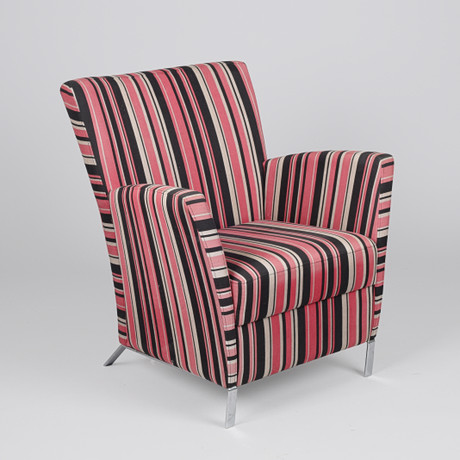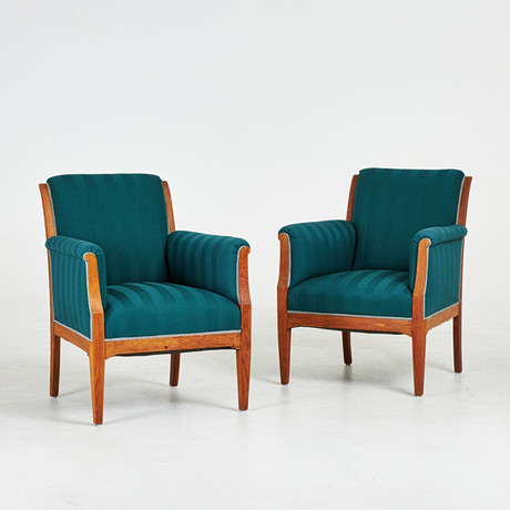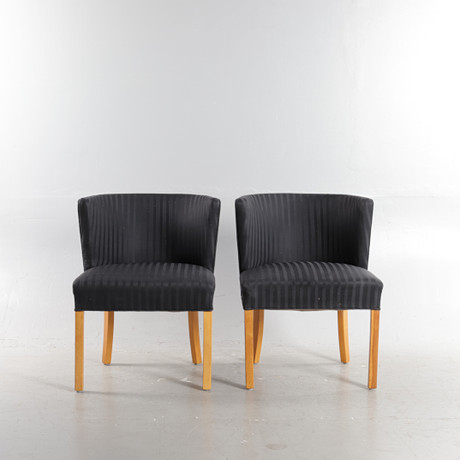 4375969. OLE WANSCHER. A pair of armchairs with stained beech frame, seats upholstered in striped upholstery fabric, model 1675, stained beech and fabric, Fritz Hansen, Denmark, 1940s (2).
