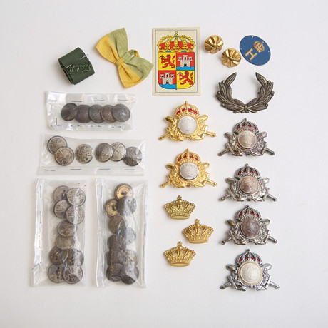 A collection of predecimal pennies and other coins, with a collection of twenty five Staybright type cap badges.
