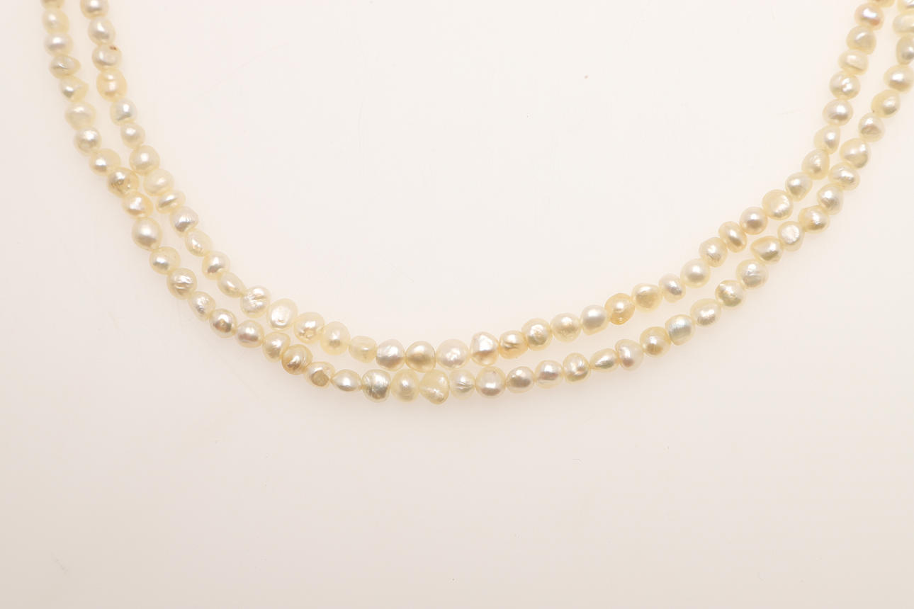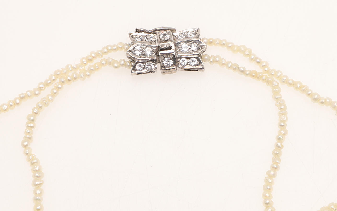 formed with graduated uneven natural peals to a clasp mounted with white stones, 52.5cm long, 22.3 grams