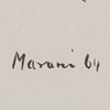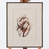 Expressive abstract composition with sweeping brushstrokes in black, brown, red and ochre yellow.