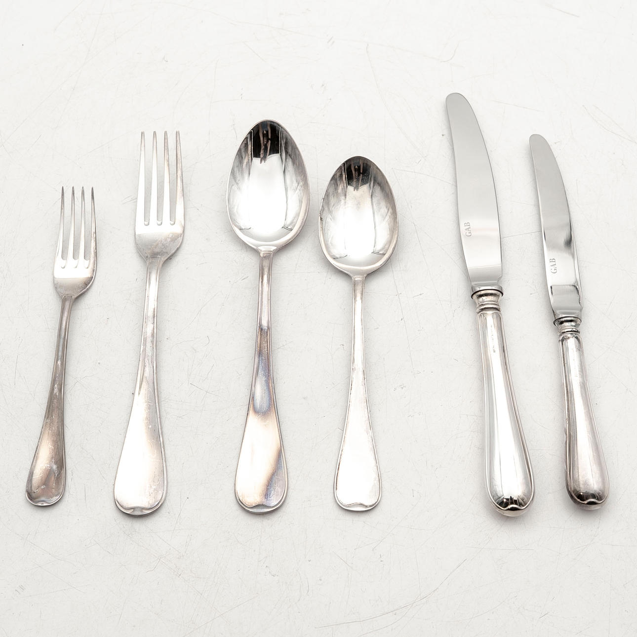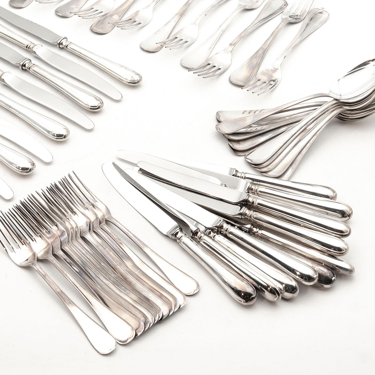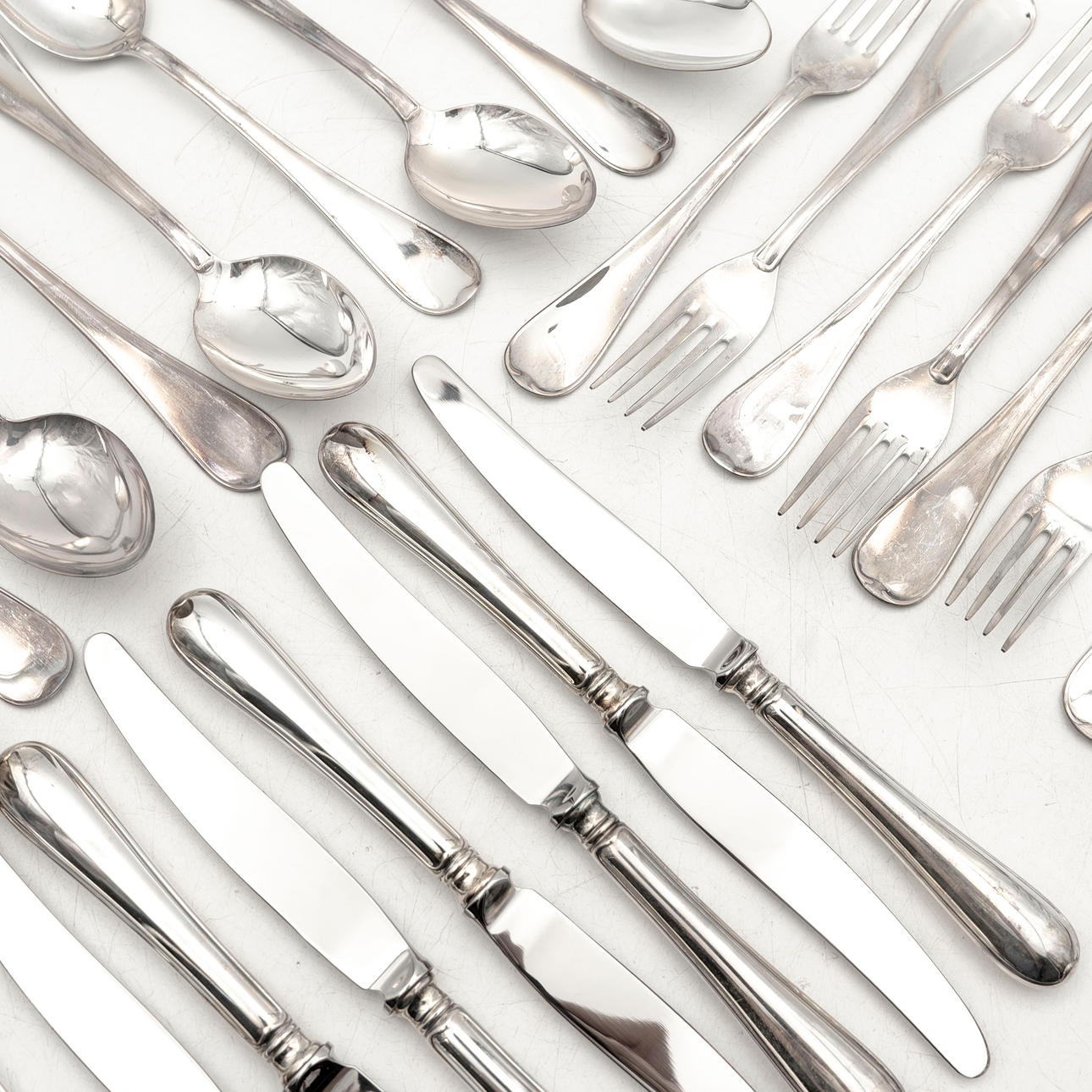 Spoons: 6pcs 15.5cm, 6pcs approx. 18 cm Forks: 6pcs 14.5cm, 6pcs approx .18cm Knives: 6pcs 18cm, 6pcs 20.5cm Total weight: 2836 grams, Of which knives: 1270 grams.