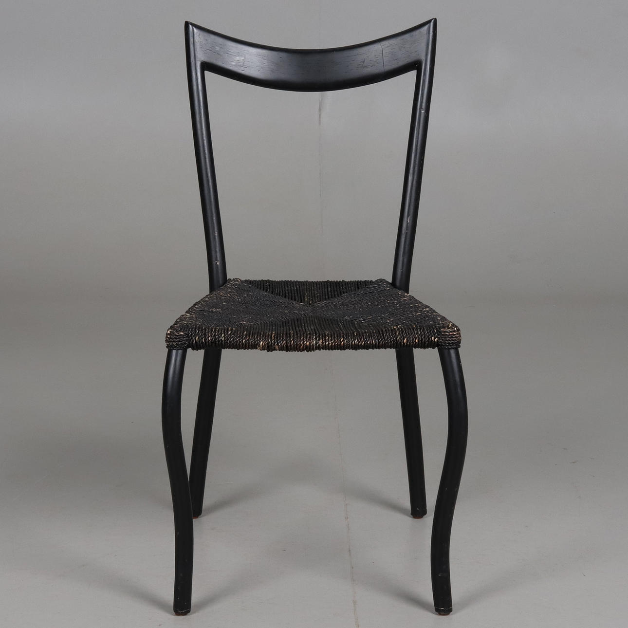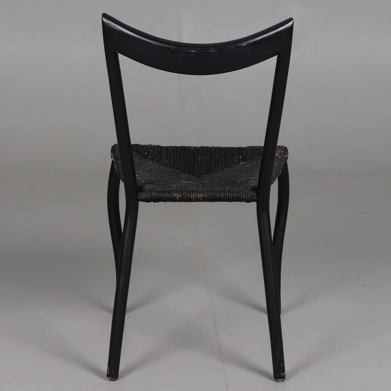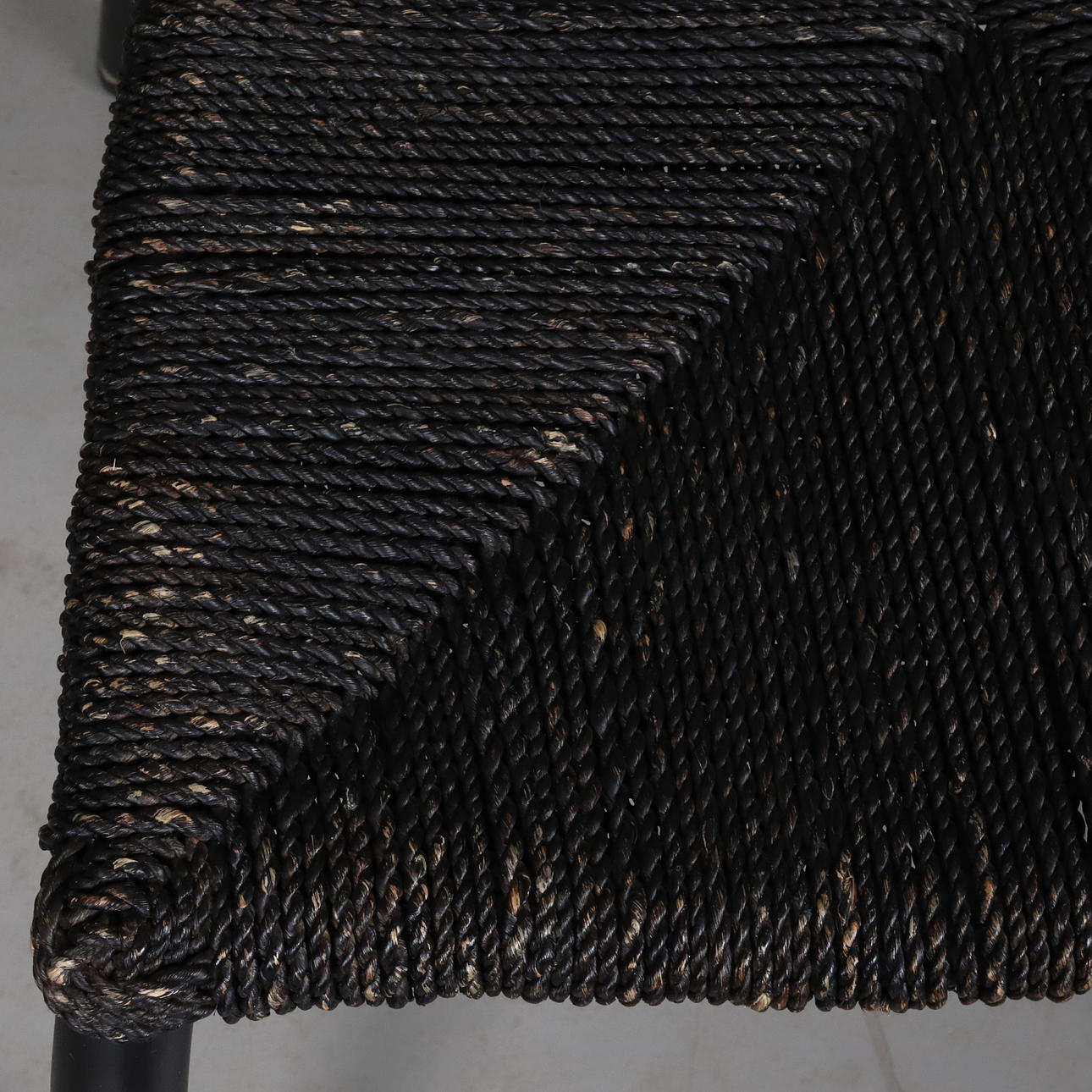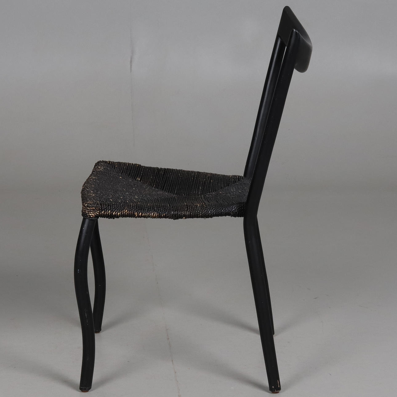 Dining chair with matt black lacquered frame and woven seat with seaweed rope.
