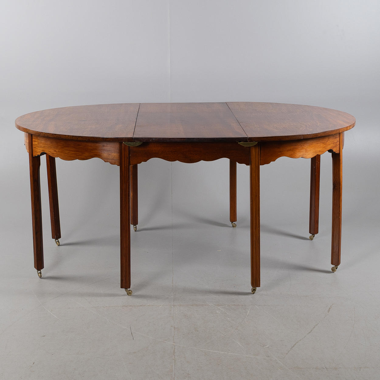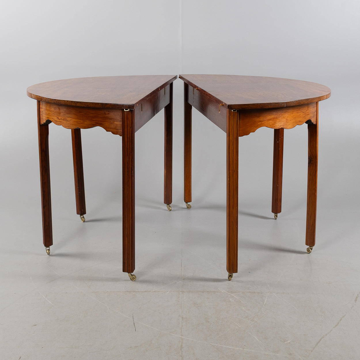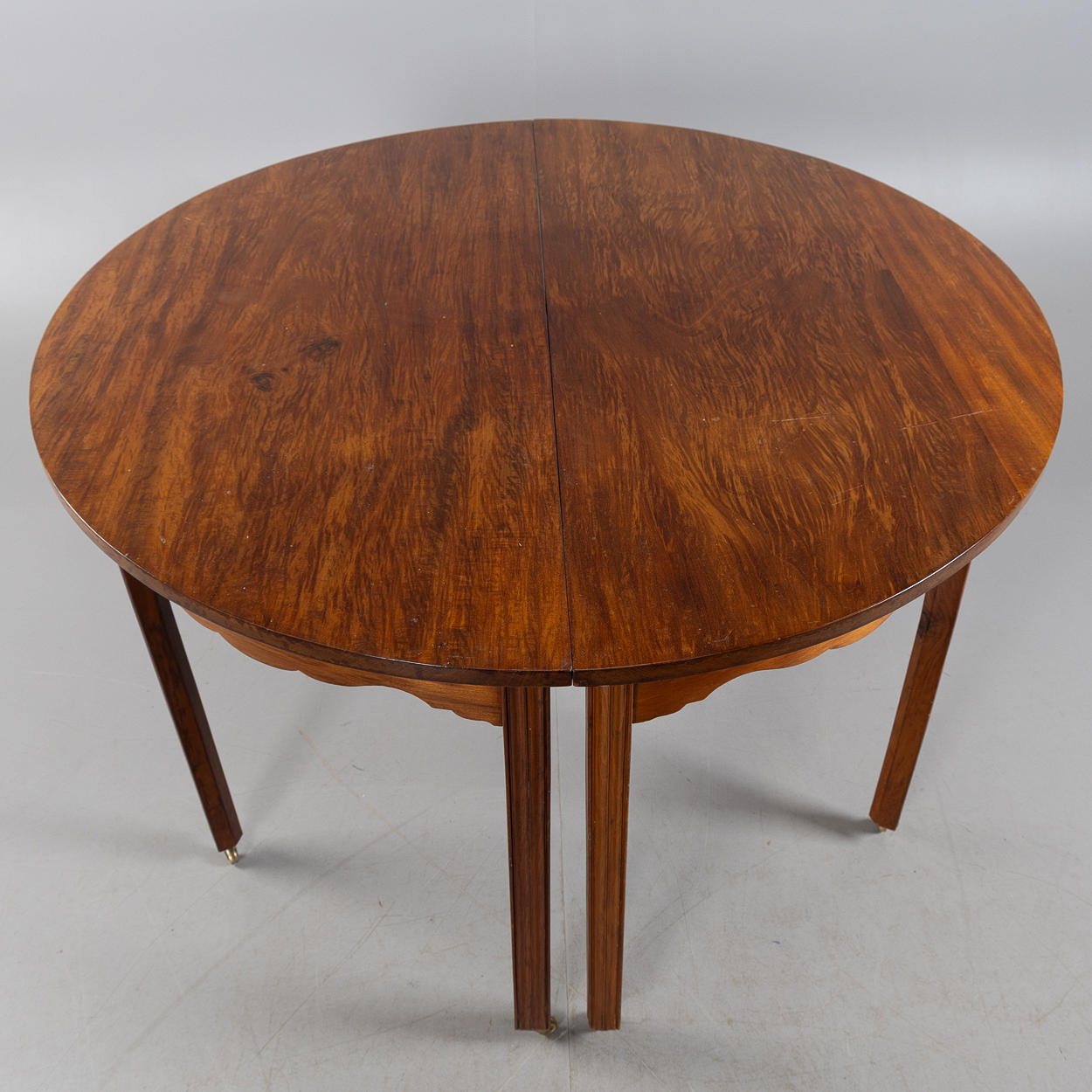 Dining table consisting of two crescent tables with solid mahogany top, leg ends fitted with brass wheels. Crescent table approx. 60 x 124 cm.