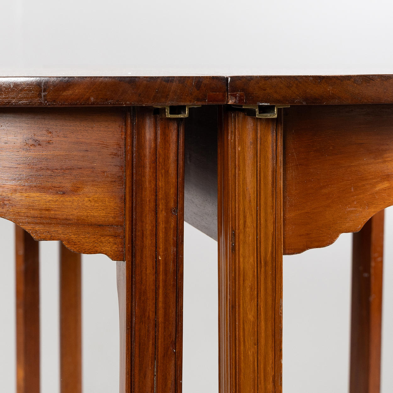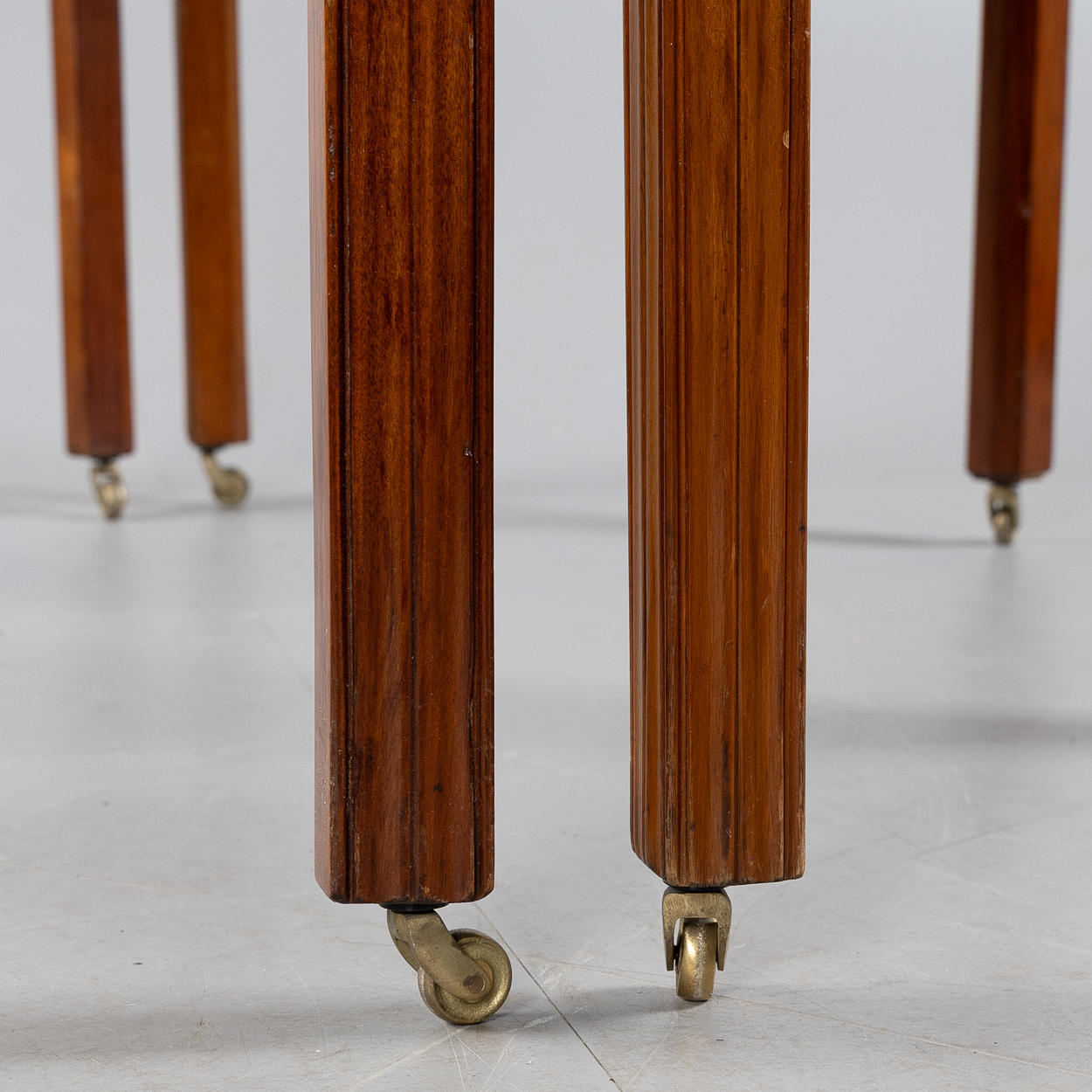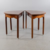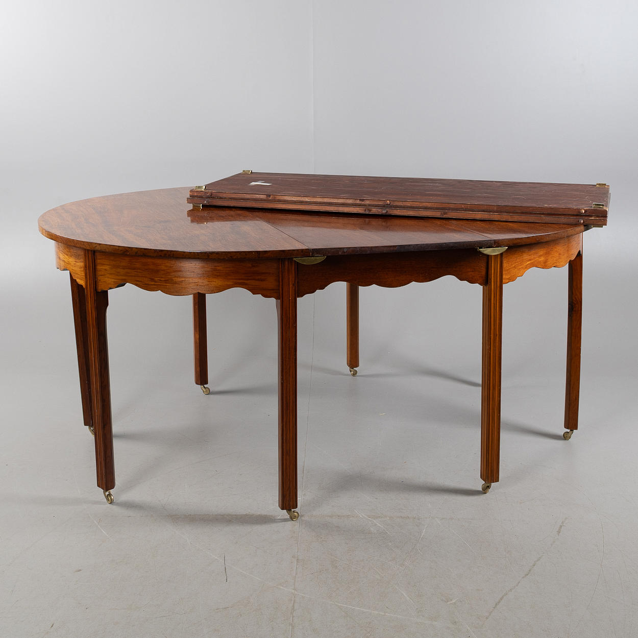 Dining table consisting of two crescent tables with solid mahogany top, leg ends fitted with brass wheels. Crescent table approx. 60 x 124 cm.