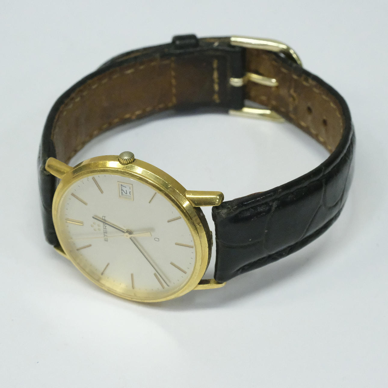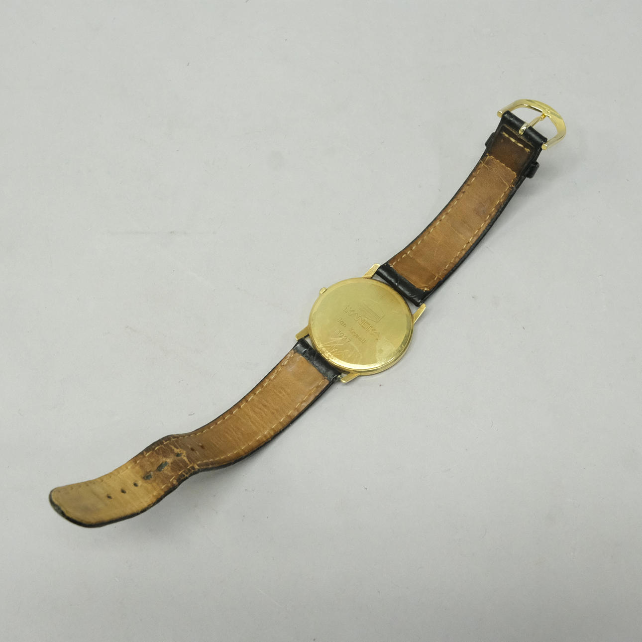 Crown button with wear, possibly replaced. Engraving. Not tested, no functional warranty is provided. Strap not original, wear.