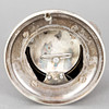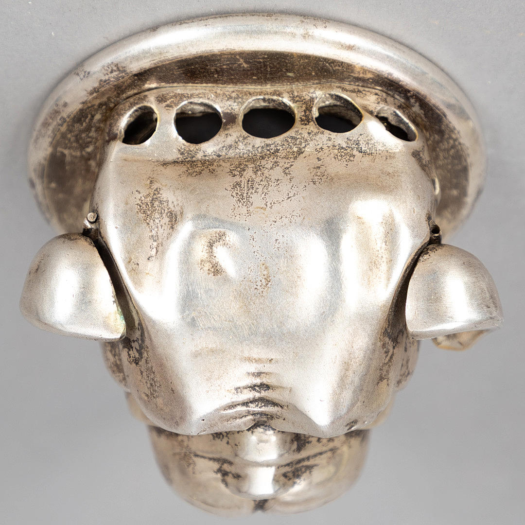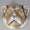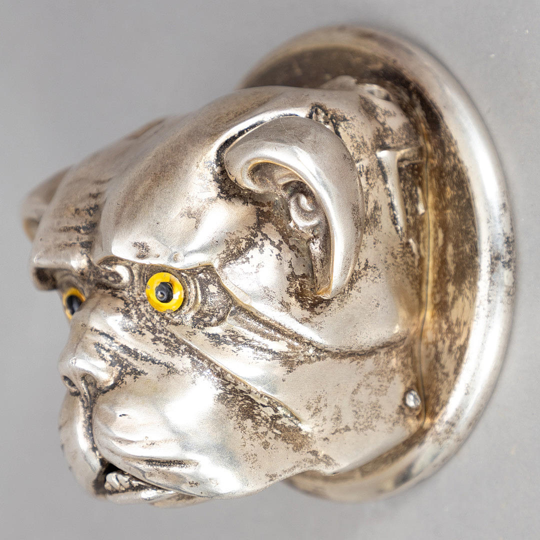 Receiving bell in the shape of a bulldog head made of solid silver-plated metal with two glass eyes. Built-in wind-up clock Can be set up or hung on the wall (Makes a bell sound by pulling on your ears or squeezing your teeth). Dimensions approx. Diameter 12 cm, height 9 cm.