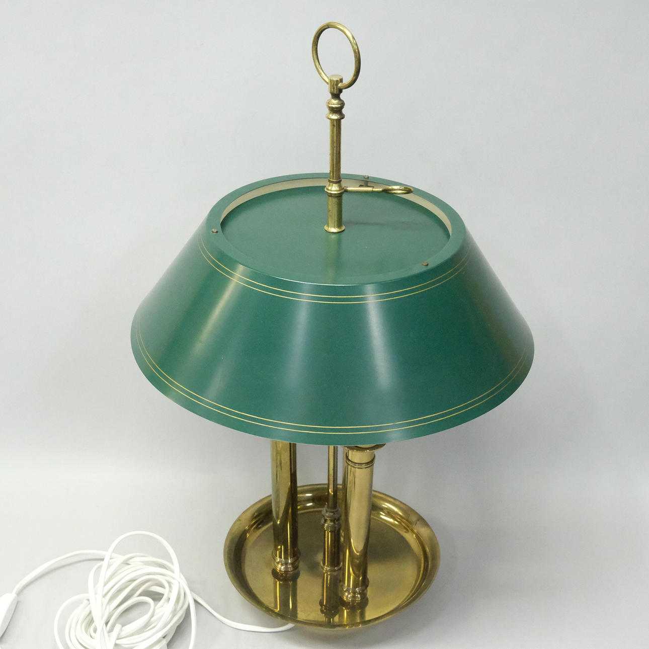 Brass, with three light points, shade of green lacquered sheet, Denmark, second half of the 20th century, height 60, diameter 36 cm.
