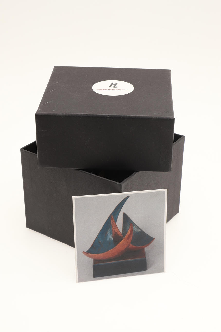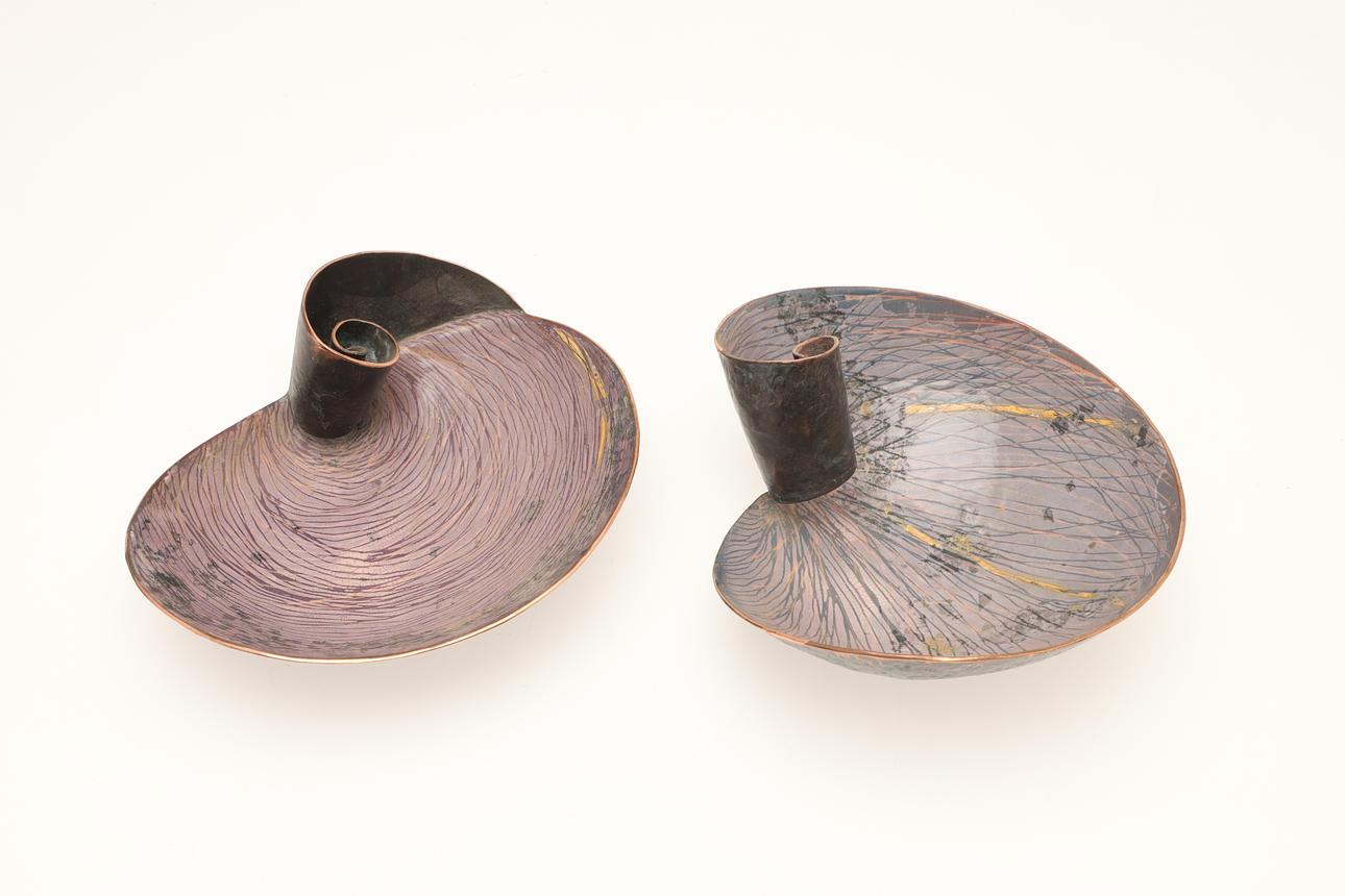 Including two copper and vitreous enamel shell shaped dishes, on a wooden plinth (dishes 14cms across), also with two boxed copper planished sails on wooden plinths (boxes 12cms and 11cms high).