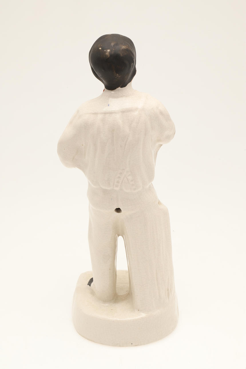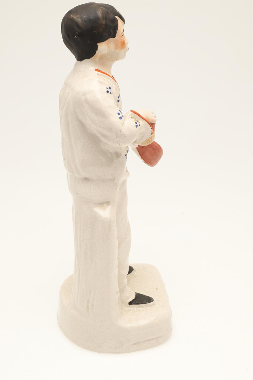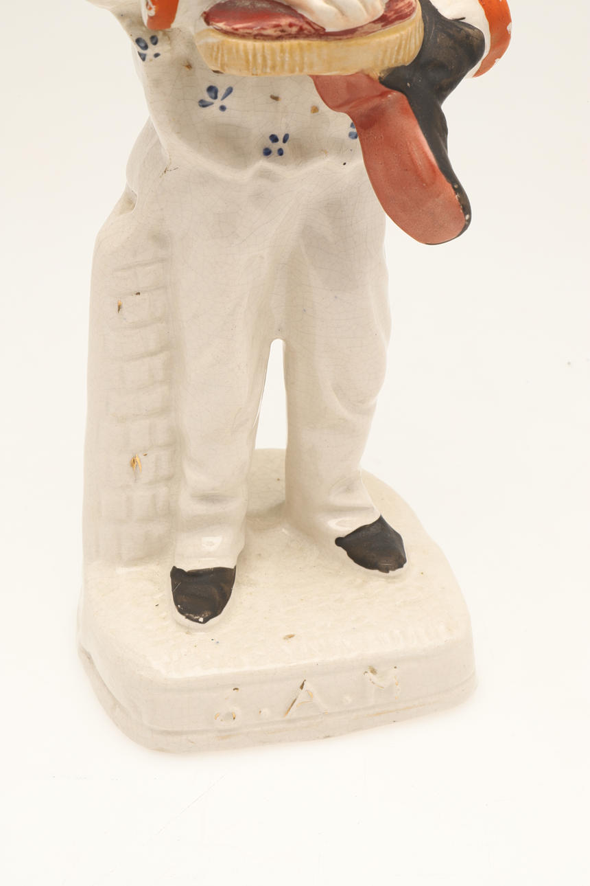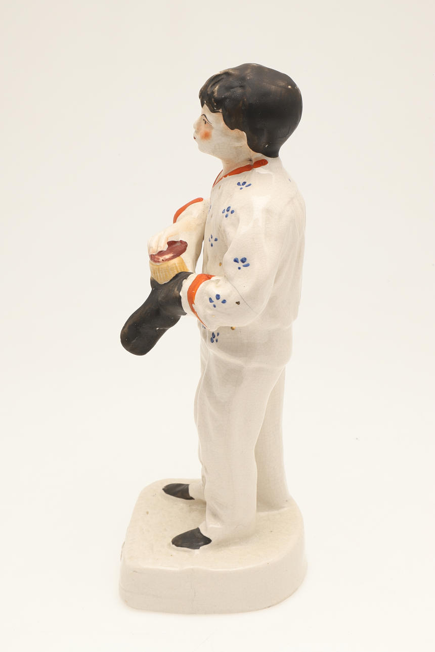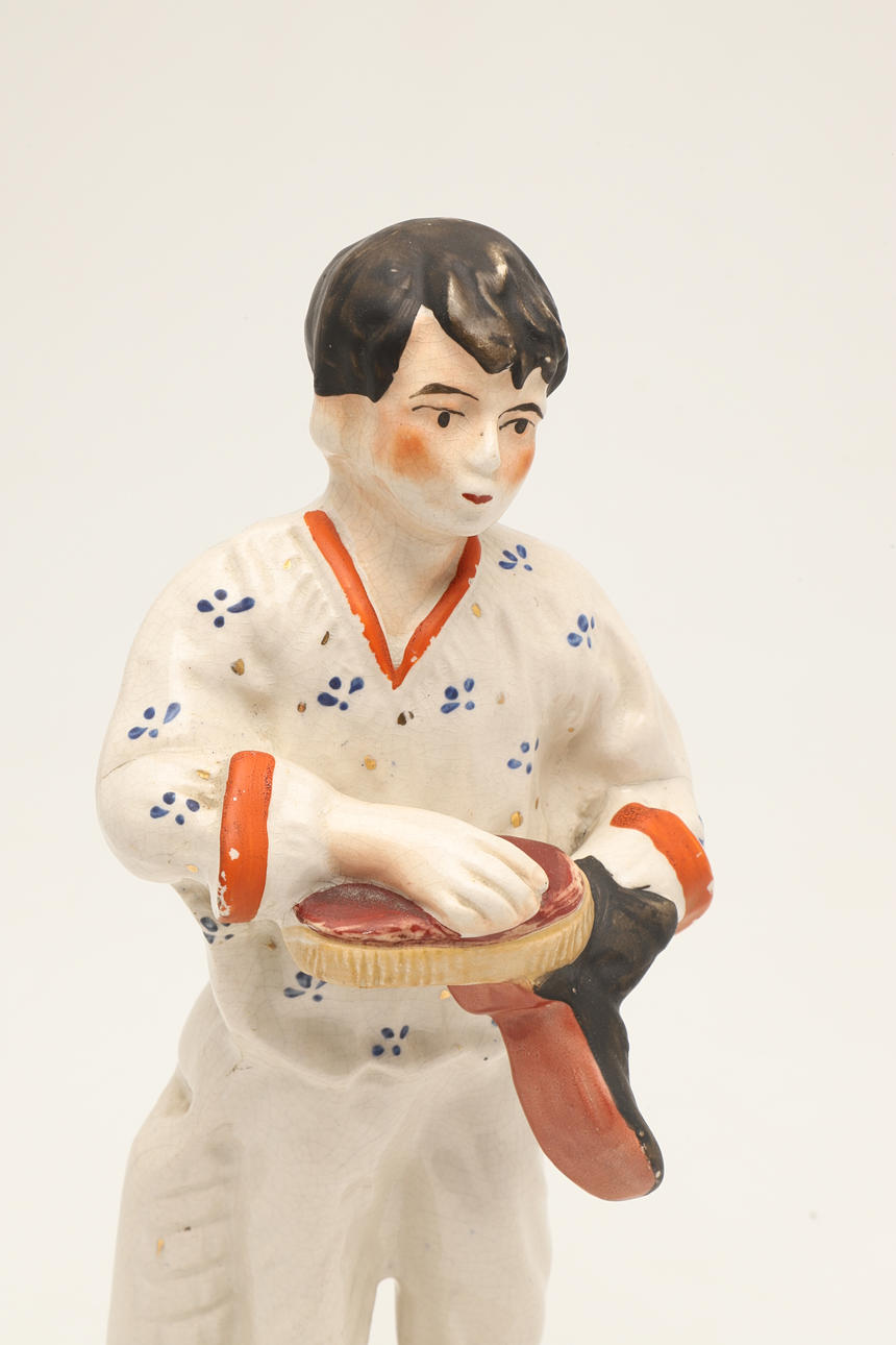 A large flatback pottery figure titled '6 AM', the figure polishing his boot. 32.5cms high.