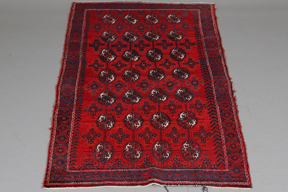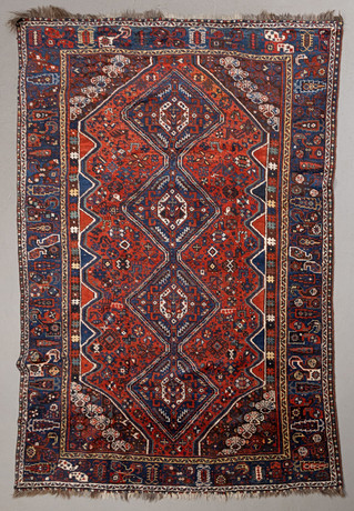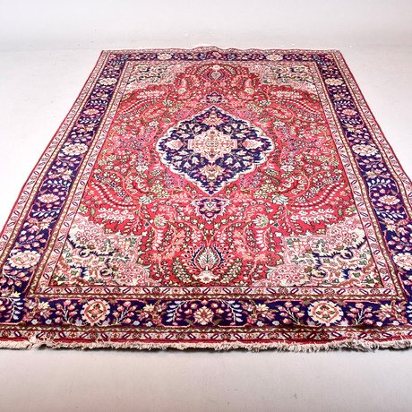 raditional hand-knotted Persian rug in heavy shades of red, dark blue, black and white. Central medallion in geometric design, surrounded by stylized plant motifs and framed by wide border
