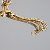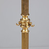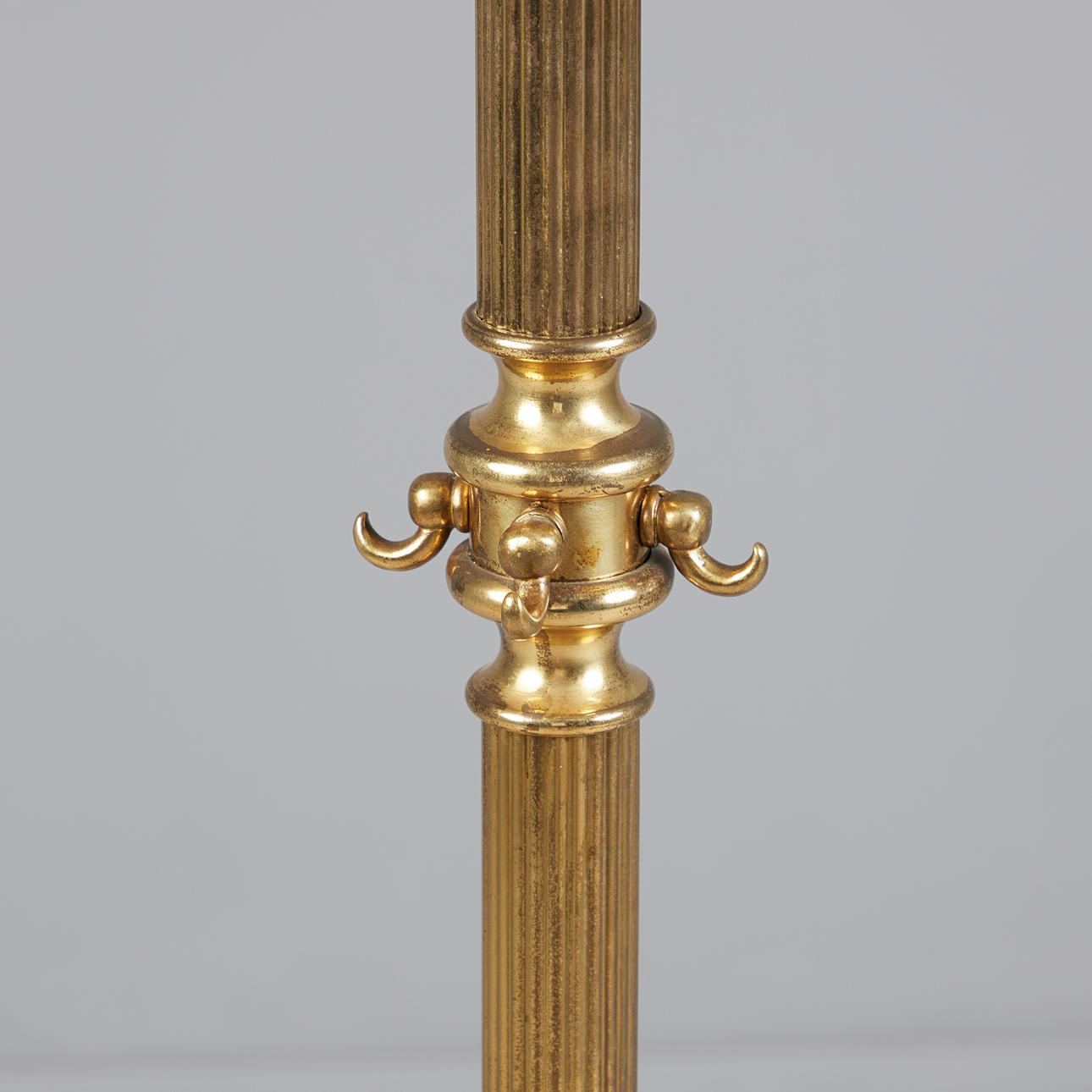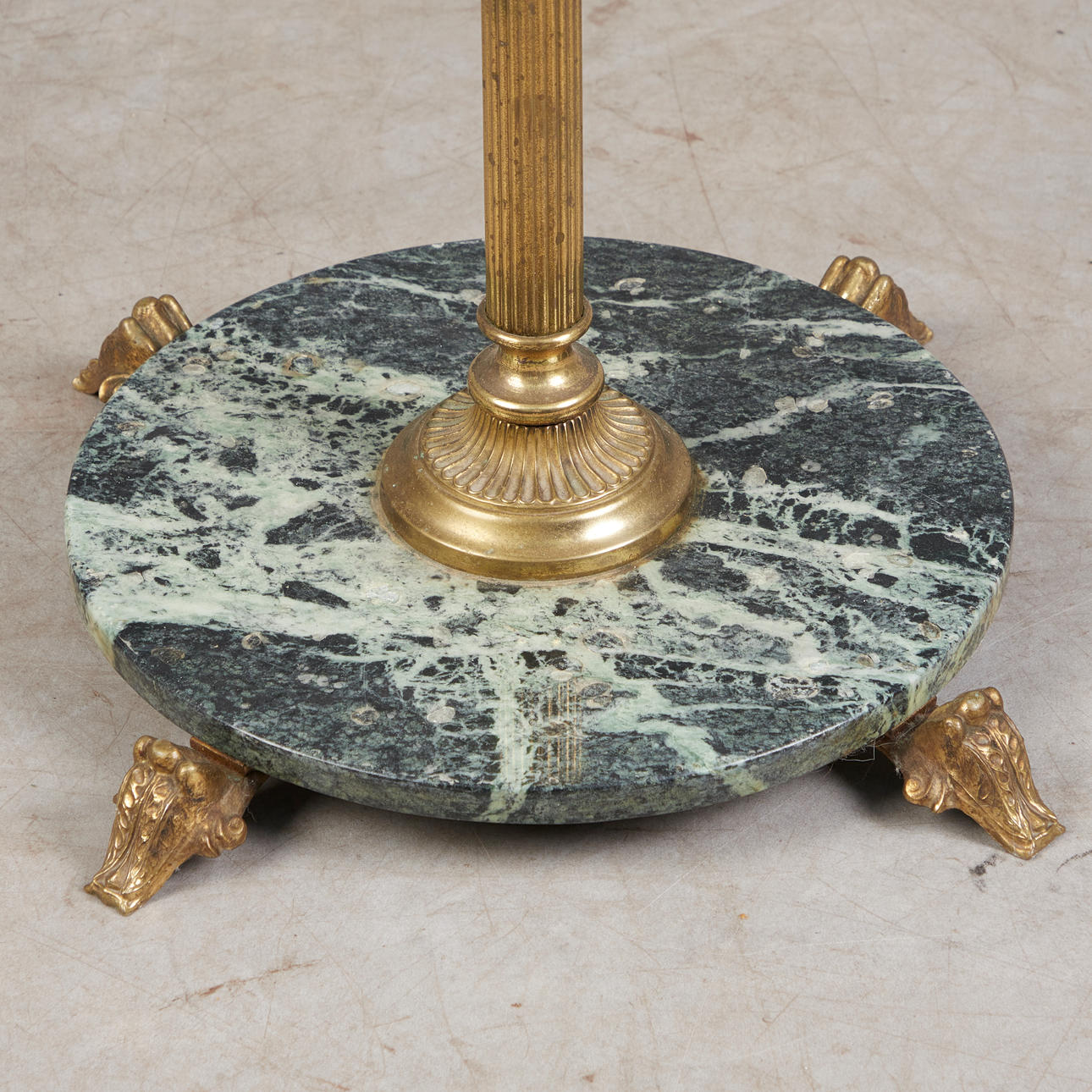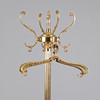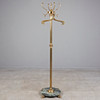 Brass coat rack with a green marble plinth on four feet, with a fluted, column-shaped stand and a rotatable head with four volute hooks, on the stand with four more hooks, with four hangers.