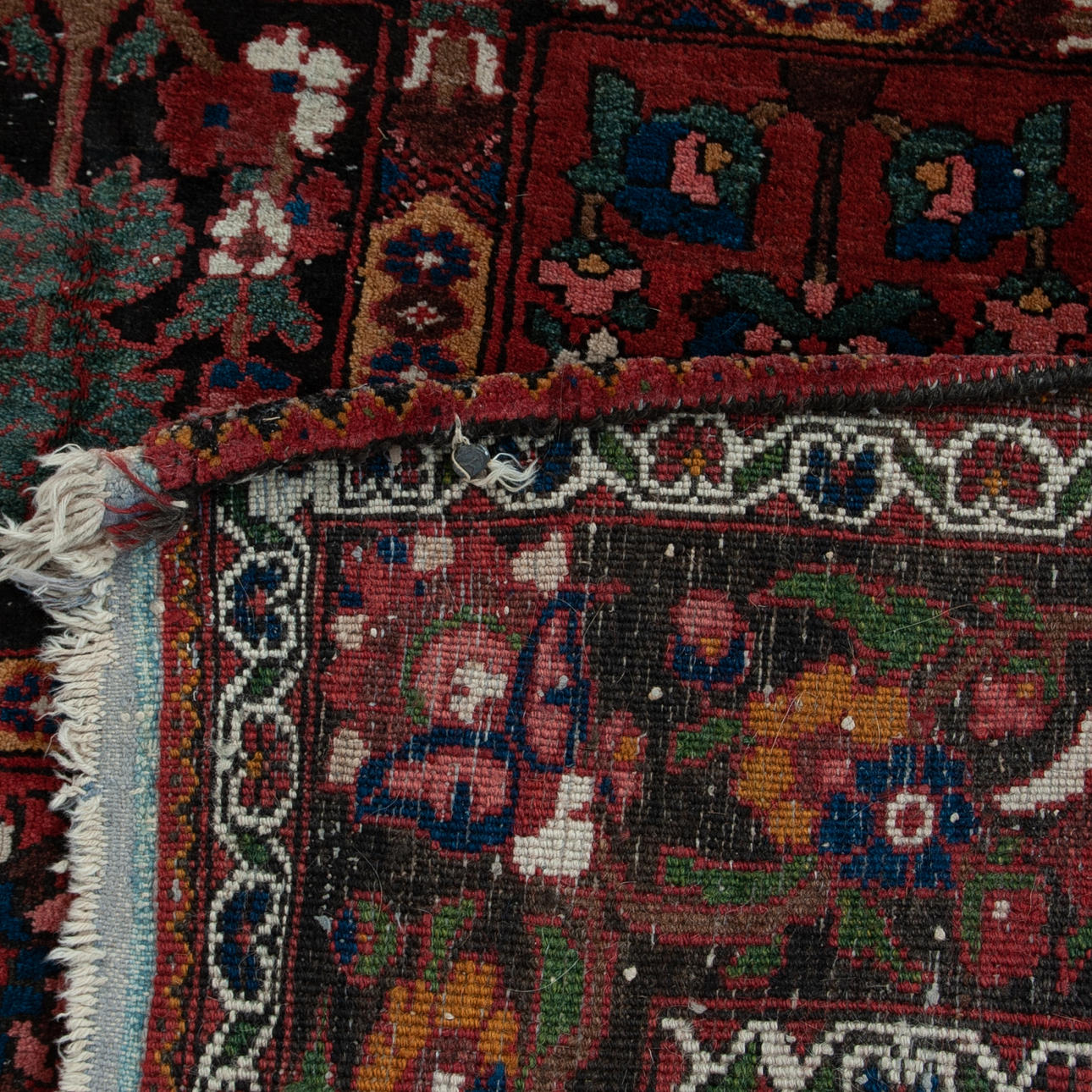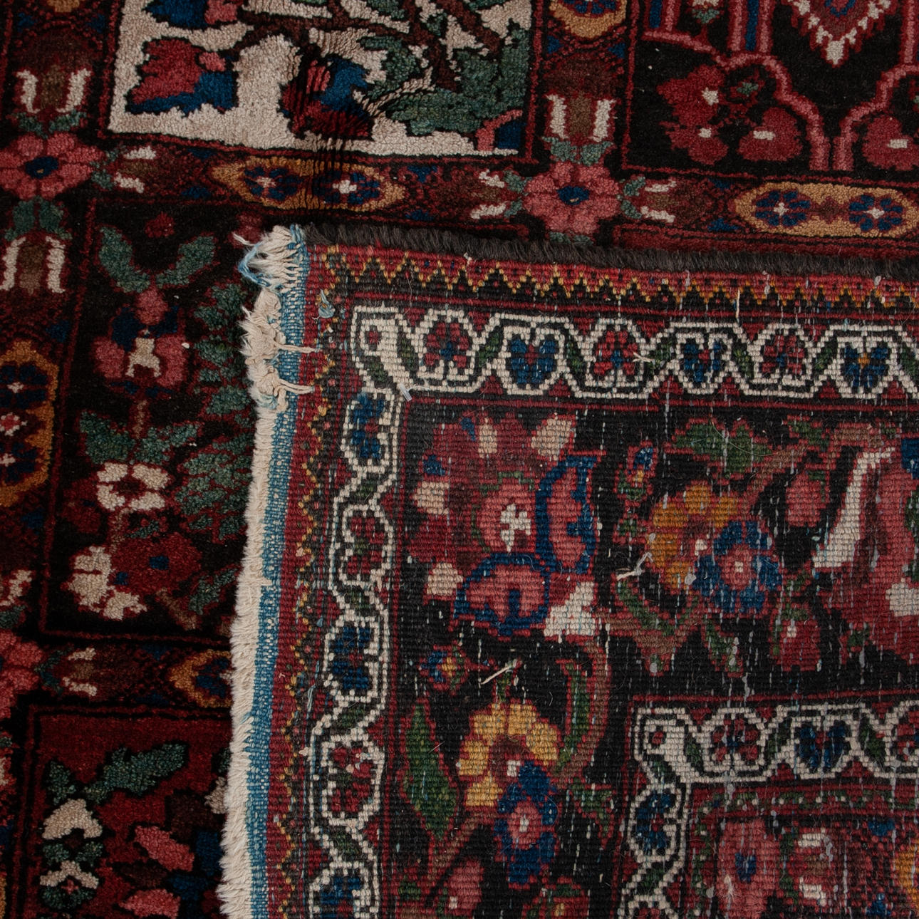 Handknotted Persian Bakhtiari carpet, likely from the mid-20th century. Classic “garden pattern” (Khesti) with routine division where each field bears flowers, trees of life or stylized plants in shades of red, blue, black, ivory and green. Dense wool floss on cotton warp.