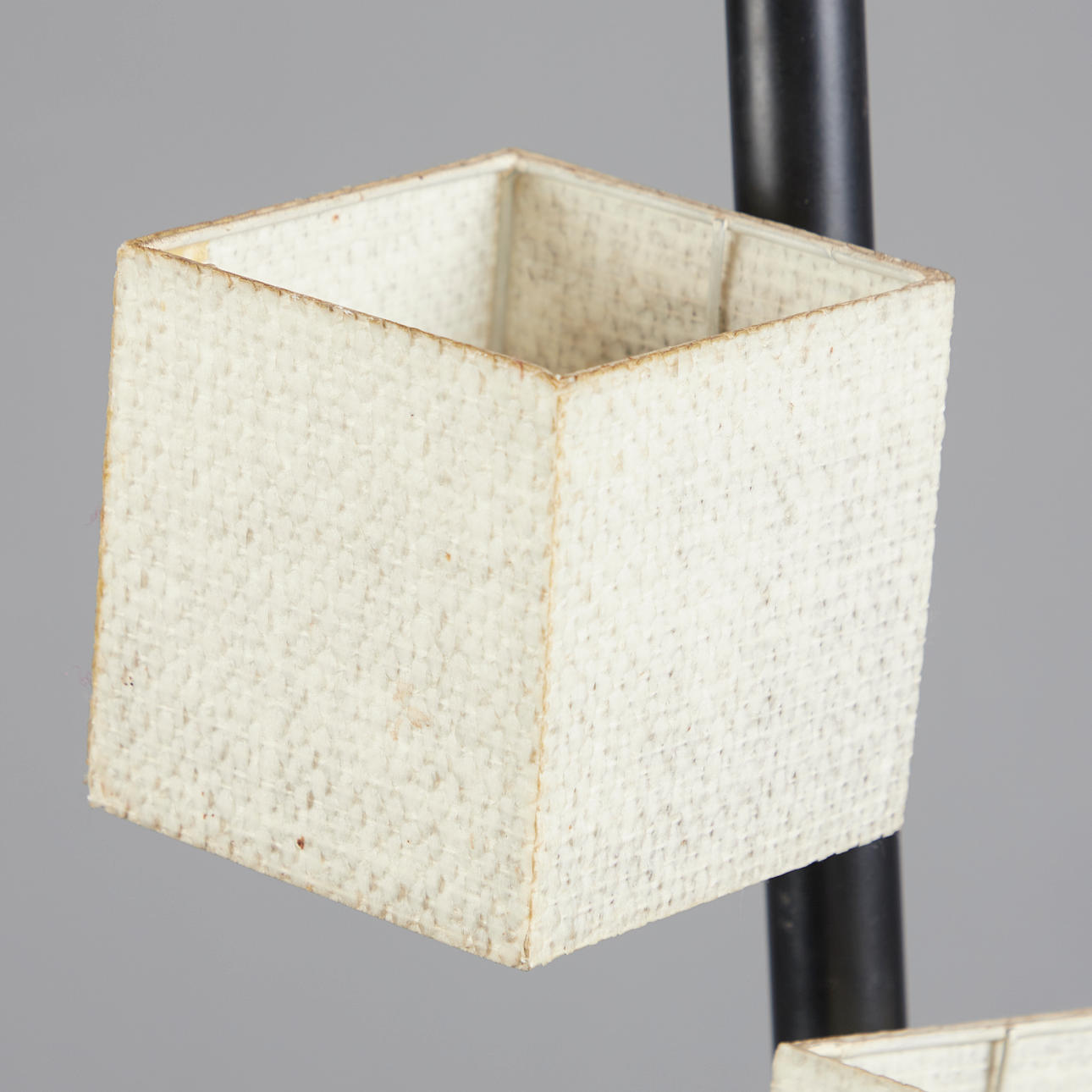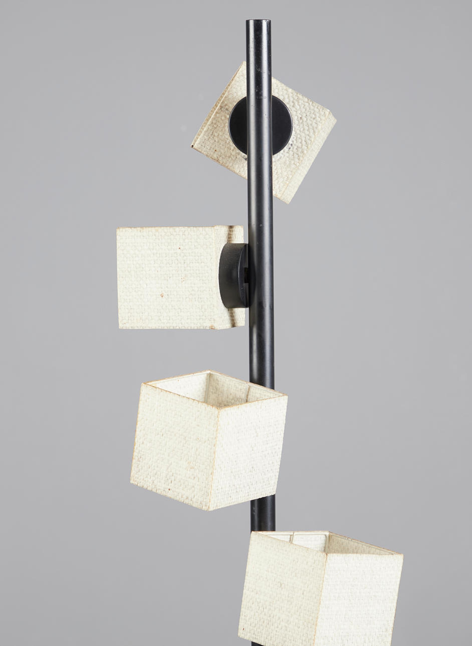 Floor lamp made of powder-coated metal in black and eight cube-shaped paper lampshades in a cascading arrangement, rotatable lampshades, provided with eight focal points, H.176.5 cm, D.27.5 cm.