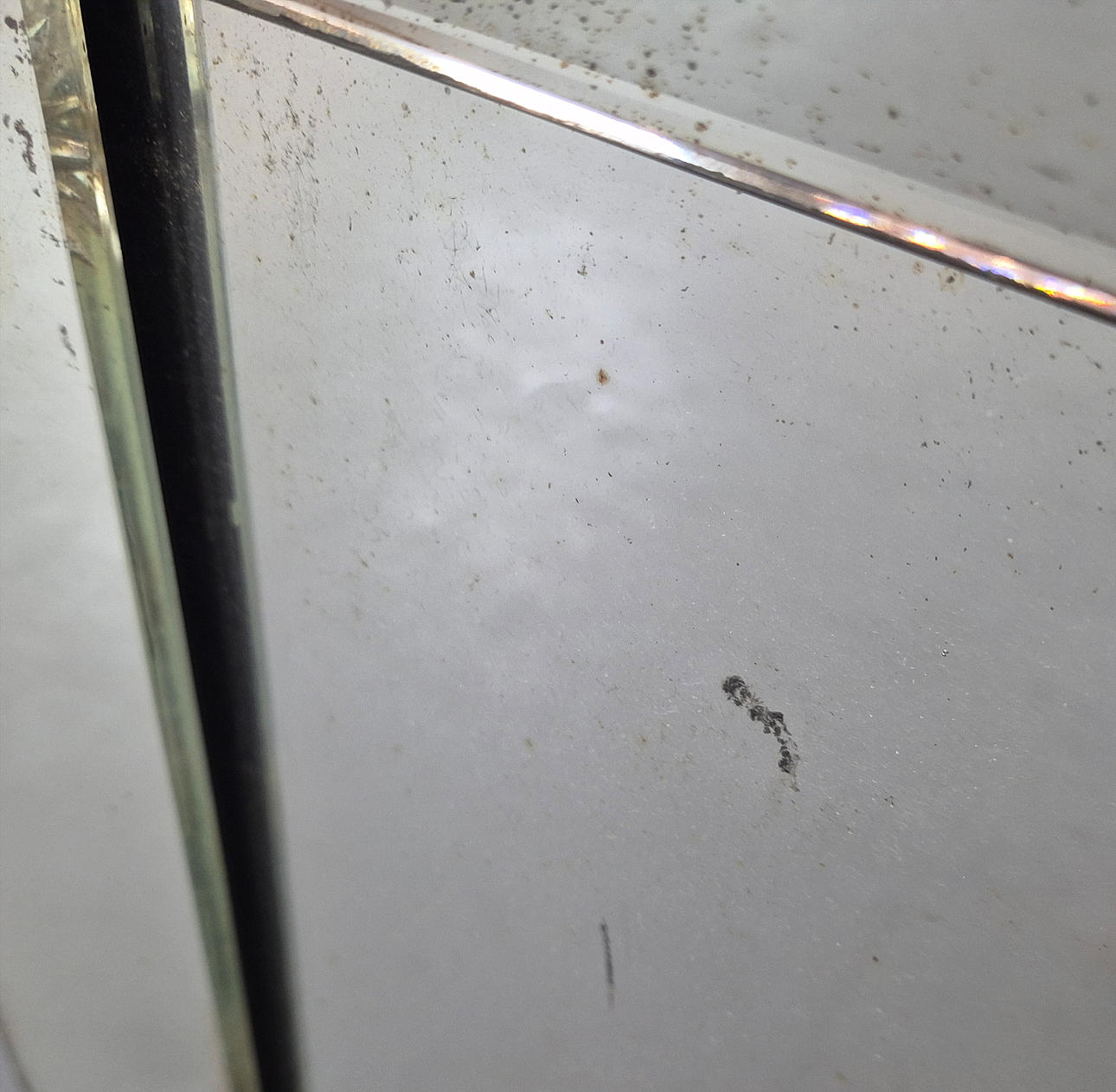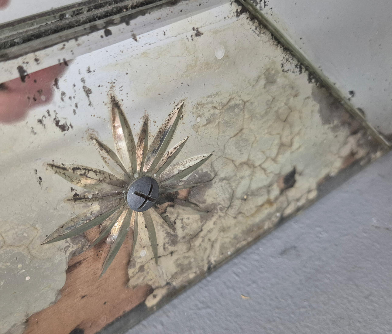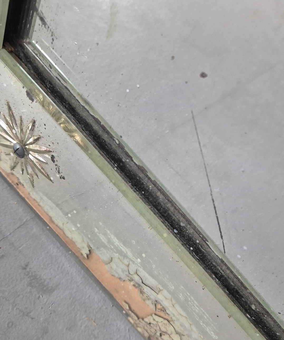 MID CENTURY WALL MIRROR WITH ETCHED DETAIL.