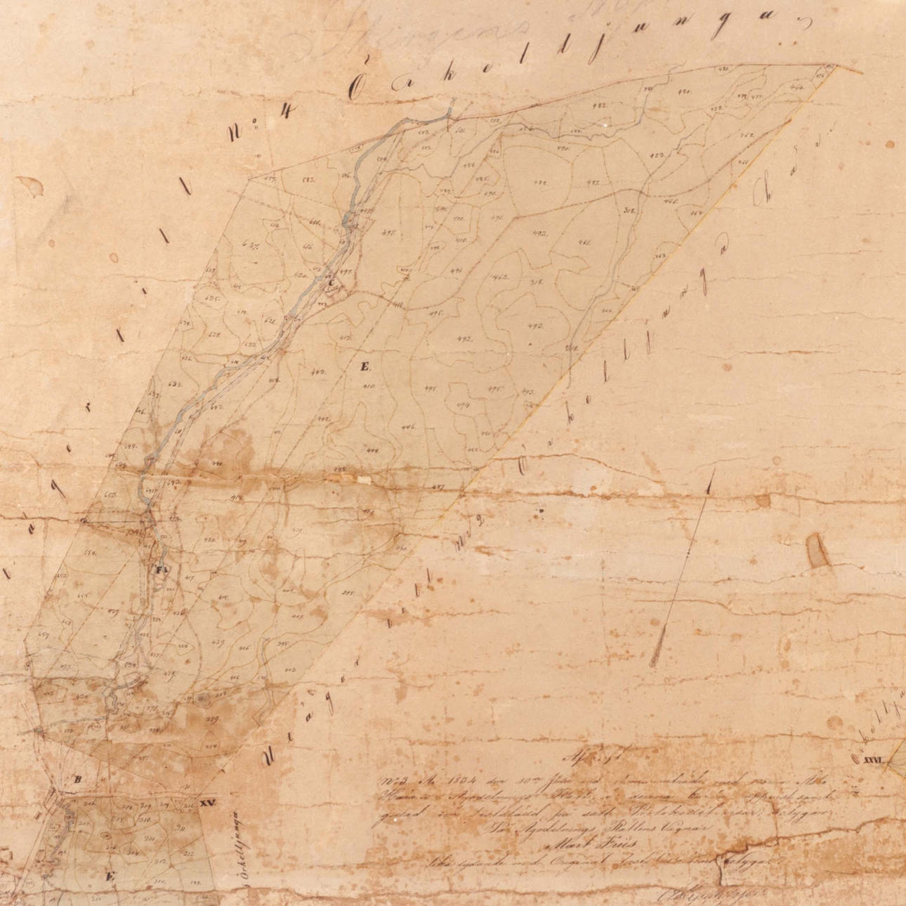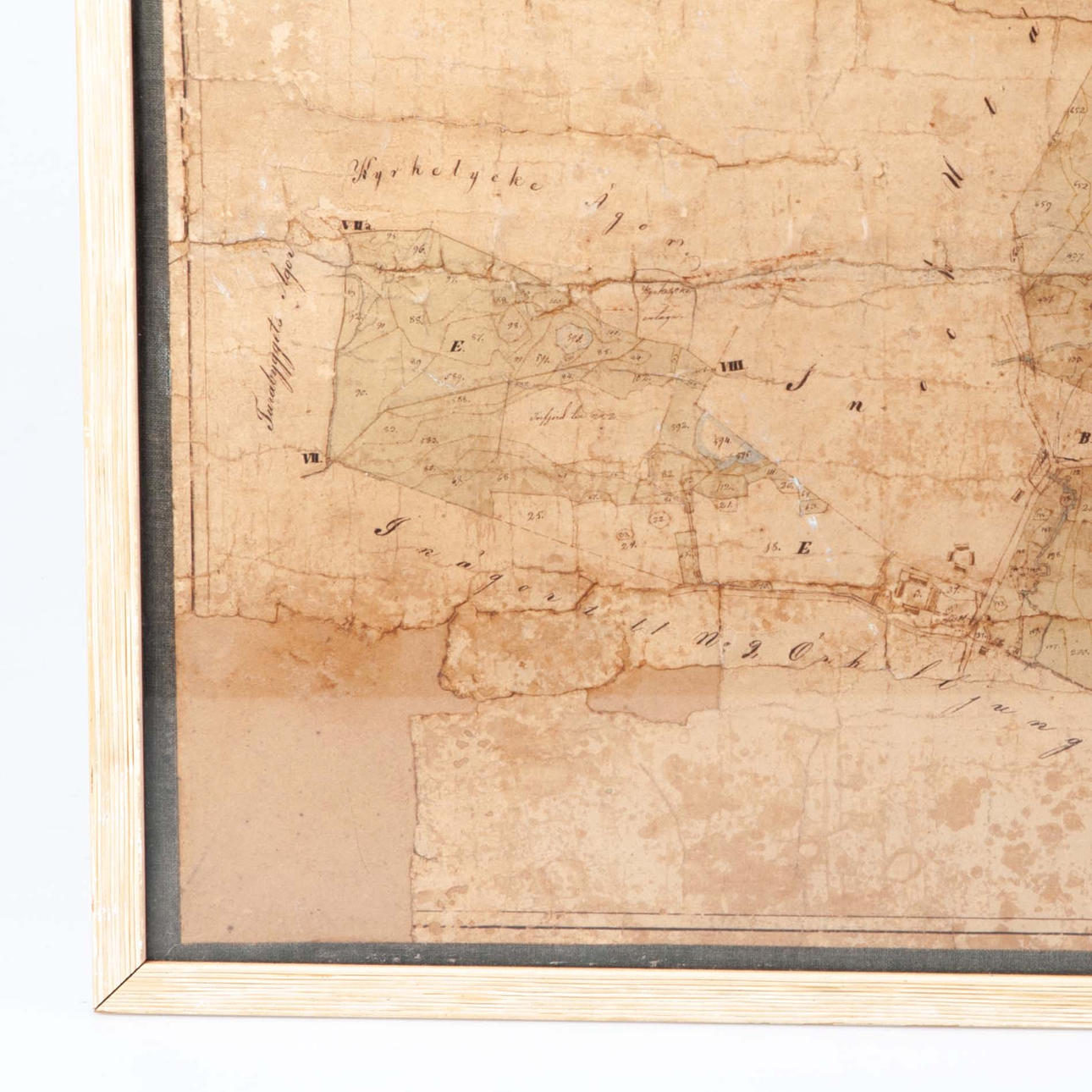 Original map of parts of Örkelljunga county and Norra Åsbo county in Christianstad county, drawn up in 1834. Conducted by the surveyor J. A. Wahlström and with additions and signatures from recent times, e.g. 1949. The map shows detailed land distribution and ownership lots with handwritten notes. Framed in light wooden frame with glass.