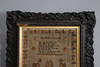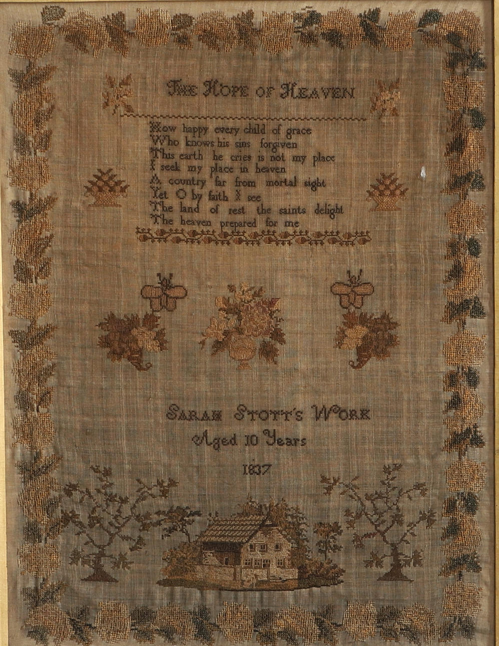 An embroidered sampler by Sarah Stott, Aged 10 Years, 1837, with a religious prose above a house and various flowers. In a carved ebonised frame. Sampler 51cms by 38cms, frame 75.5cms by 60cms.