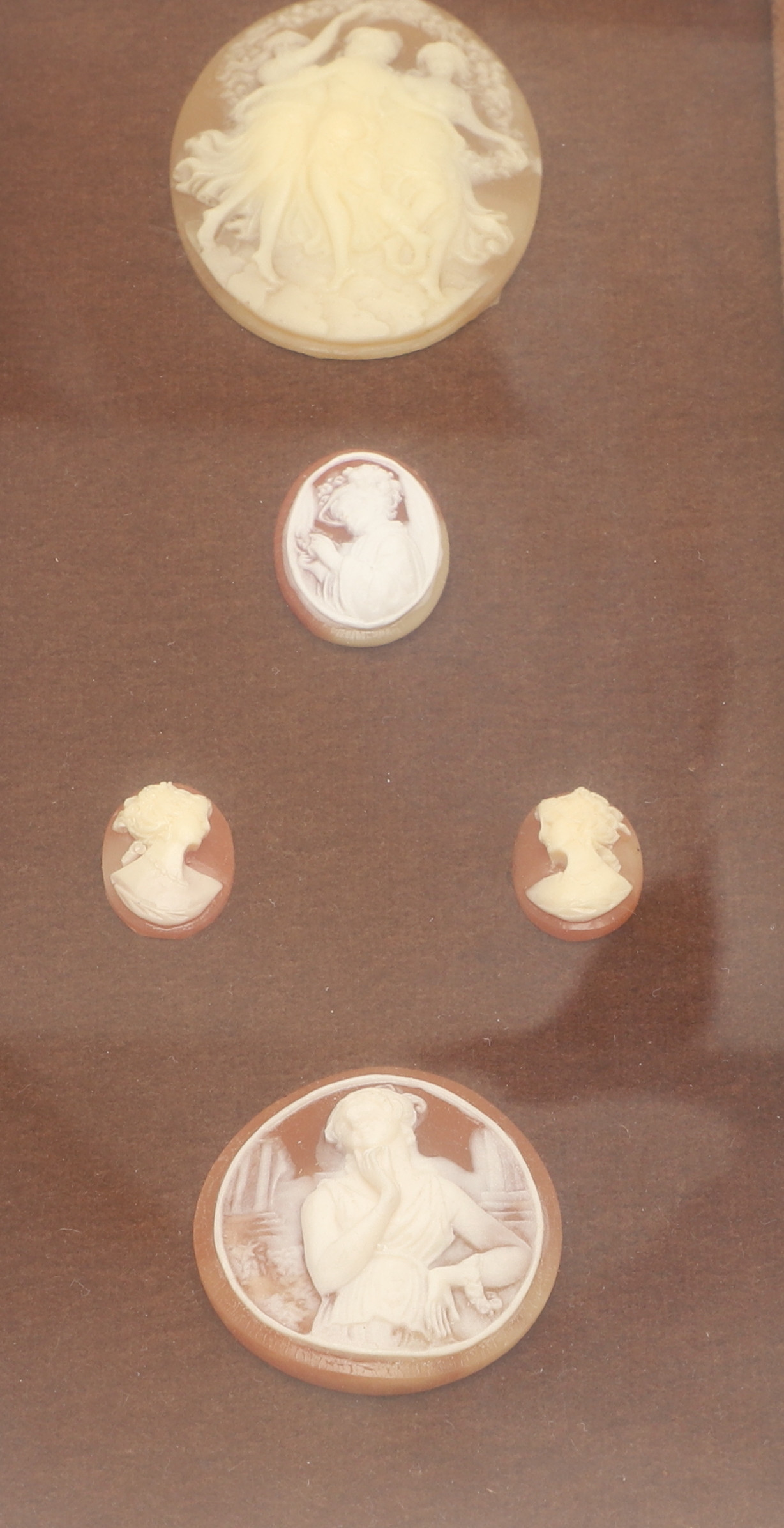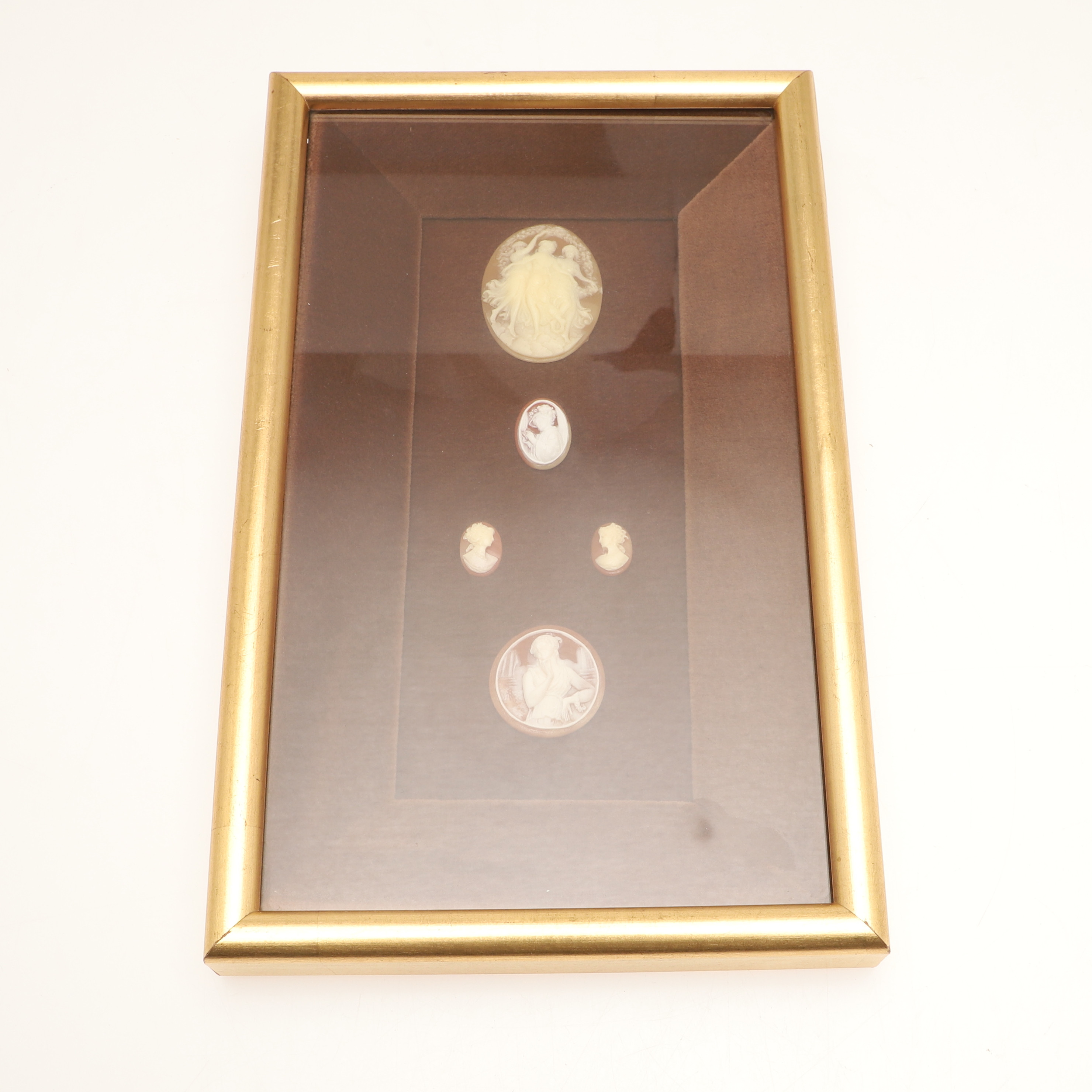 4381922. FIVE UNMOUNTED SHELL CAMEOS IN GLASS FRAME.