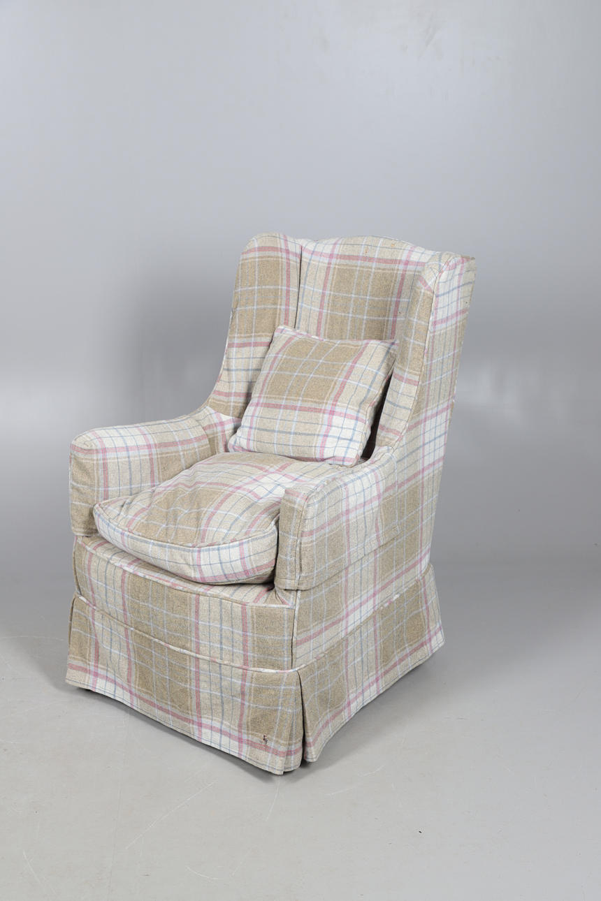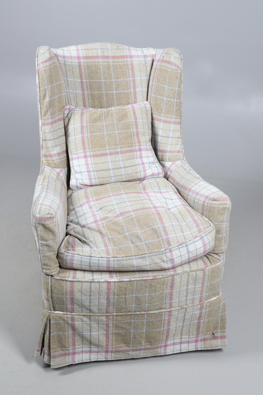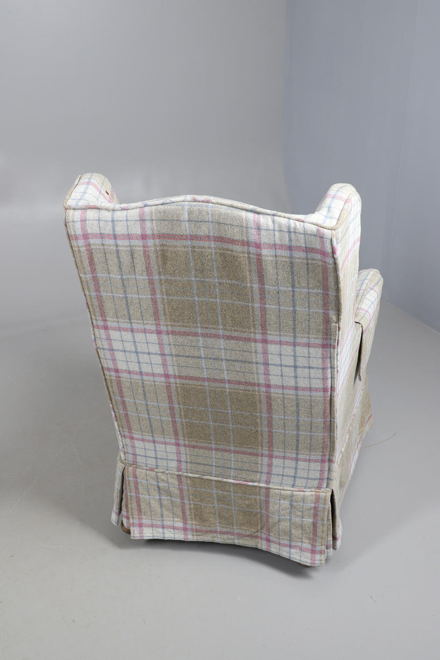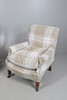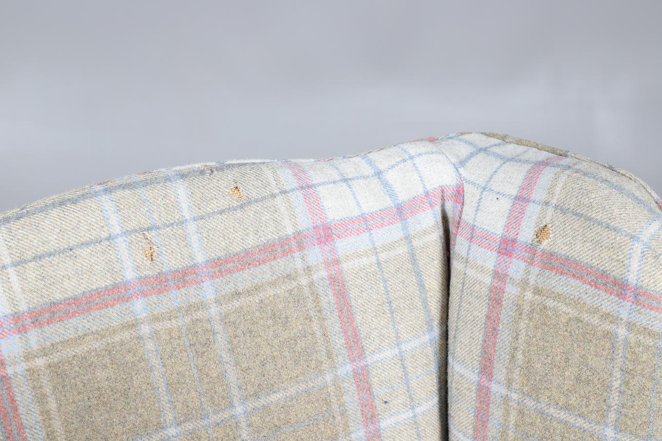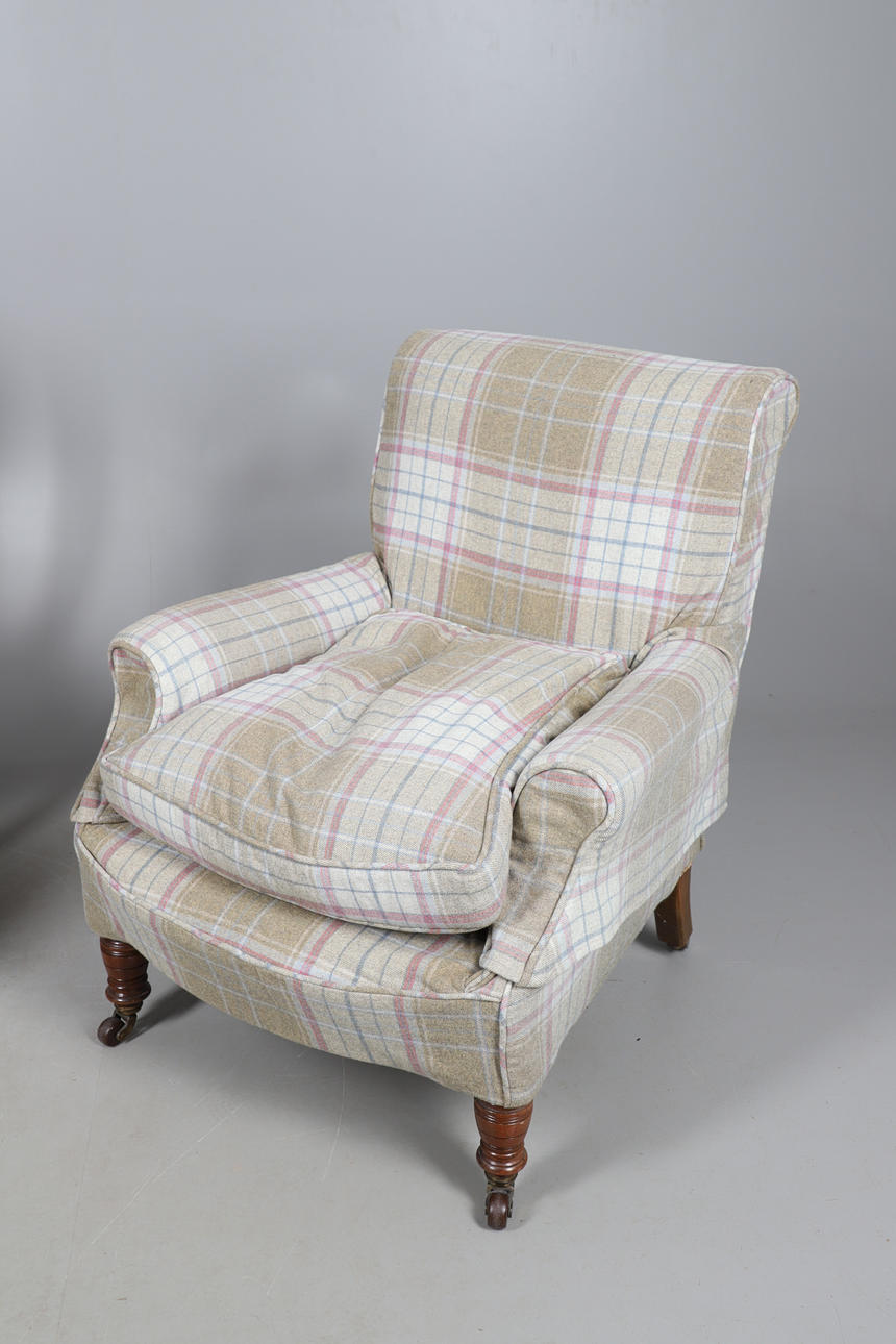 upholstered in wool check fabric with feather filled seat cushions, 92cm high x 81cm wide x 82cm deep, and 105cm high x 73cm wide x 75cm deep; together with a 19th century mahogany elbow chair, the drop-in seat with matching fabric (3).